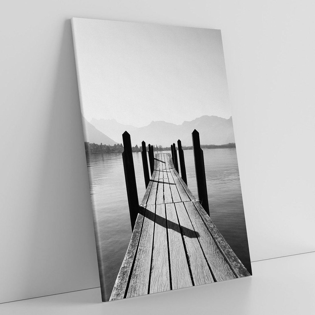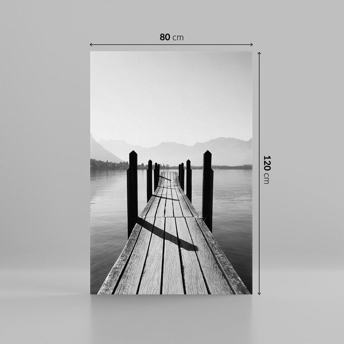 Obraz na płótnie 80x120 - Spokojna Przystań - czarno biała fotografia, drewniany pomost na jeziorze