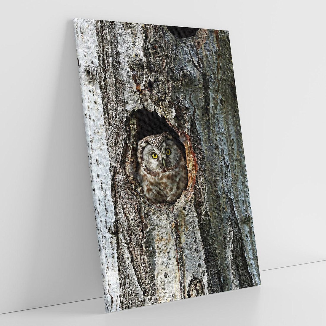 Przenieś się do świata nocy, gdzie sowa w swojej dziupli czuwa nad tajemniczym lasem. Ten ujmujący obraz na płótnie ukazuje sielski krajobraz i daje poczucie spokoju. Pozwól tej mądrej sowie wprowadzić harmonię i spokój do Twojego wnętrza.