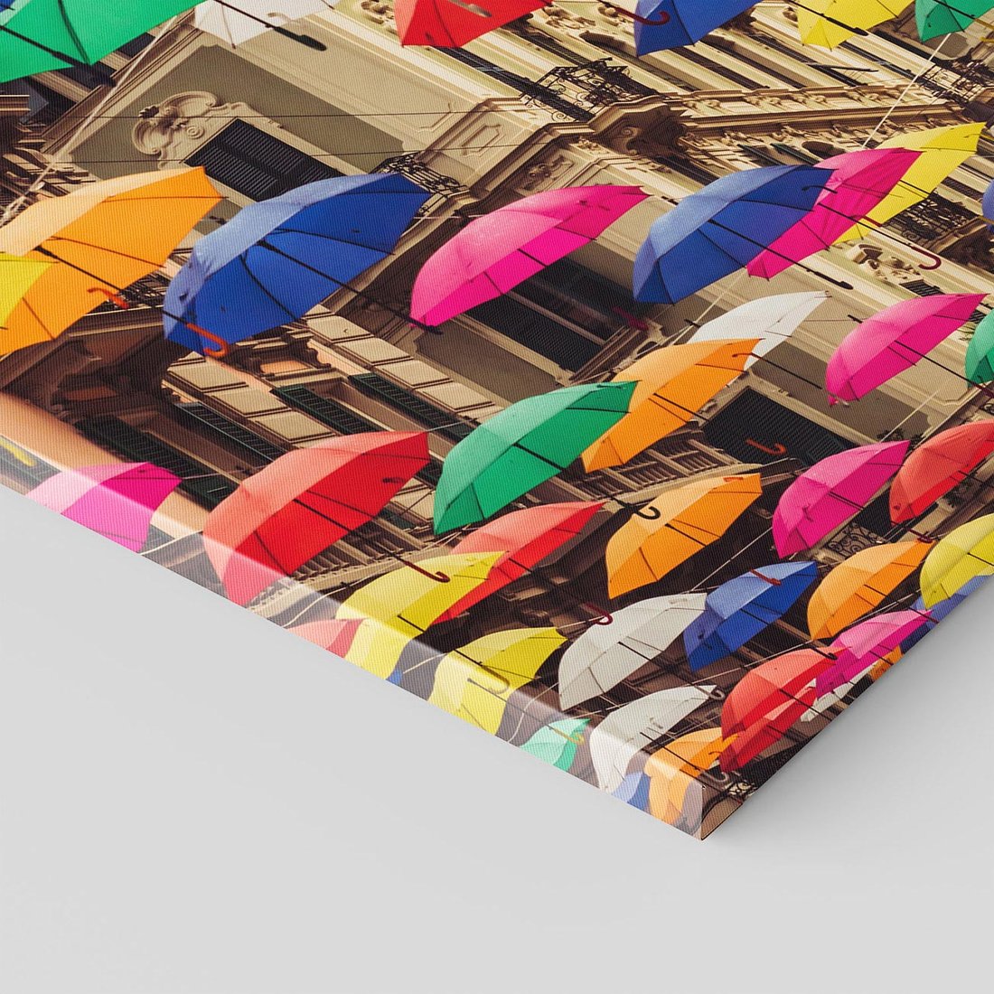 Fotografia ukazująca radosną scenę ulicy, gdzie kolorowe parasolki unoszą się nad głowami przechodniów. Ta tęczowa eksplozja kolorów tworzy niezapomnianą atmosferę, wprowadzając radość i życie do Twojego wnętrza. Te zatrzymane w kadrze chwile przypomną Ci o urokach codziennego życia.