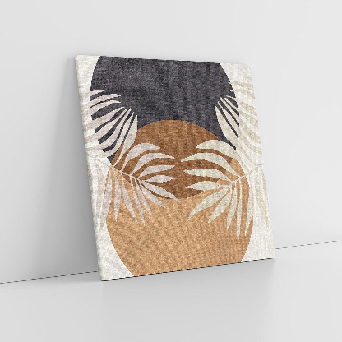 Odkryj wyjątkowy obraz w stylu boho, gdzie symetria i dwa duże koła po środku przyciągają uwagę. Brąz i czerń tworzą elegancką paletę barw. Po bokach umieszczone są delikatne liście palmy, dodające tropikalnego uroku. To dzieło sztuki stworzone dla miłośników stylu boho, którzy pragną wnieść artystyczną duszę do swoich wnętrz.