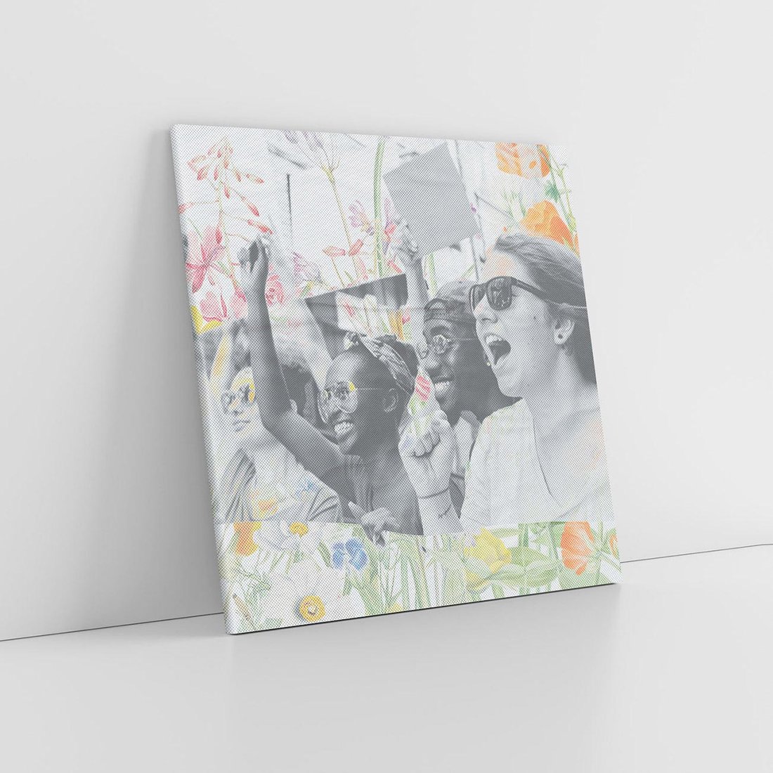 Zapraszamy do odkrycia tego wyjątkowego kolażu, który ukazuje czarno-białe zdjęcie wesołych młodych ludzi, otoczonych tłem z kwiatów retro. Doskonały akcent dla tych, którzy pragną wprowadzić do swoich wnętrz unikalny i radosny wyraz.