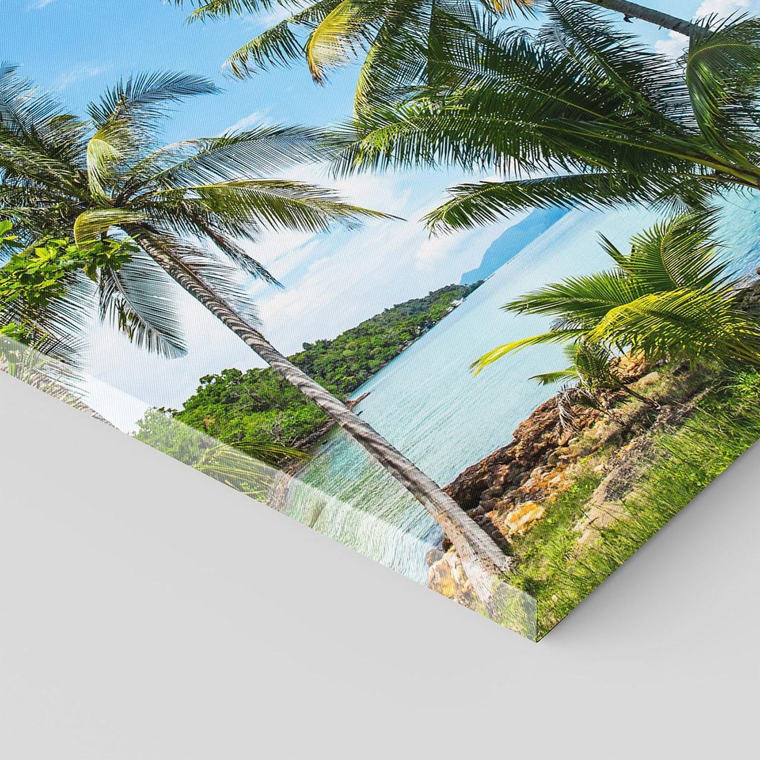 Przywołaj atmosferę rajskiej plaży dzięki temu urzekającemu obrazowi przedstawiającemu palmy nad morzem. Błękitne fale, złote plaże i bujna roślinność tworzą relaksującą atmosferę. Ta kompozycja dodaje egzotycznego uroku i wakacyjnego nastroju, idealna dla miłośników plażowych klimatów i beztroskiego wypoczynku.