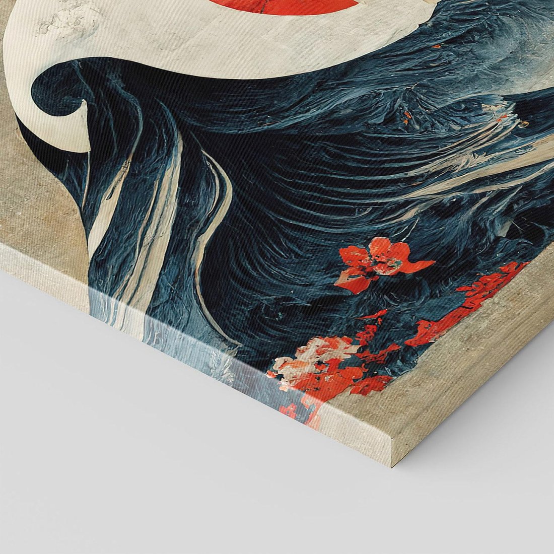 Przenieś się do fascynującego świata sztuki japońskiej z tym ujmującym obrazem. Fale oceanu oraz odcienie bieli i czerwieni ożywiają płótno, a kwiaty wiśni dodają delikatnego uroku. To dzieło sztuki stworzone dla miłośników elegancji i natury. Doskonały akcent dla tych, którzy pragną wprowadzić harmonię i subtelny wyraz do swoich wnętrz.
