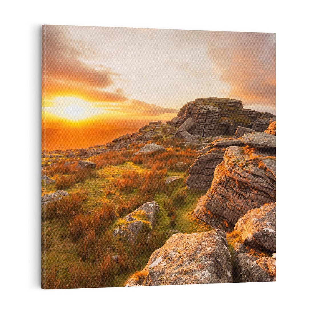 Ten impresjonistyczny obraz na płótnie ukazuje skały oplątane promieniami słońca. Jego ciepłe kolory, kontrast światła i cienia oraz naturalne formacje skalne dodają siły i piękna do Twojego wnętrza. Odczuj moc natury i harmonię krajobrazu w swoim domu.