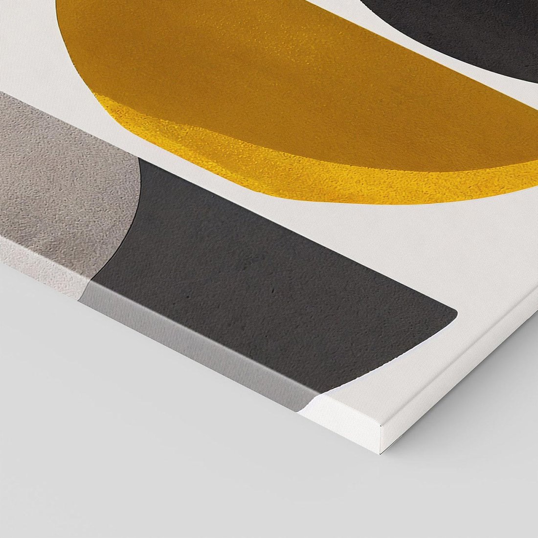 Zachwycający obraz przedstawiający nowoczesną abstrakcję z geometrycznymi półkolami i kształtami w intensywnych kolorach żółtym i czarnym na beżowym tle. Doskonały wybór dla miłośników sztuki poszukujących unikalnej i wyrazistej dekoracji do nowoczesnych przestrzeni. Geometryczna precyzja i harmonia barw przyciągają wzrok i nadają wnętrzu nowoczesnego charakteru.