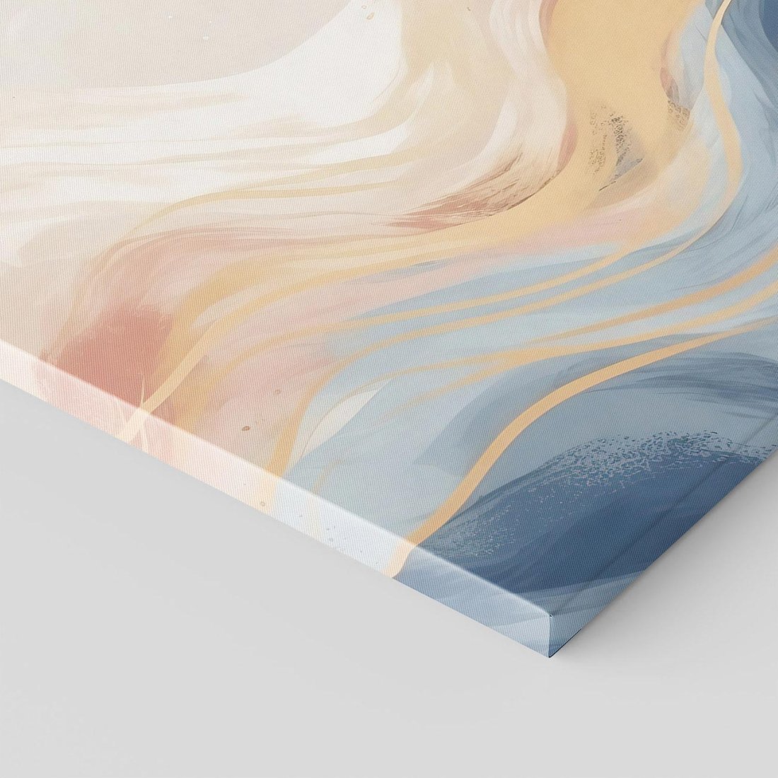 Odkryj elegancję w subtelnych abstrakcyjnych falach na płótnie. Gładkie linie tworzą klasyczne kształty, a delikatne pastelowe kolory dodają przyjemnej atmosfery, idealnej do ozdobienia Twojego domu.