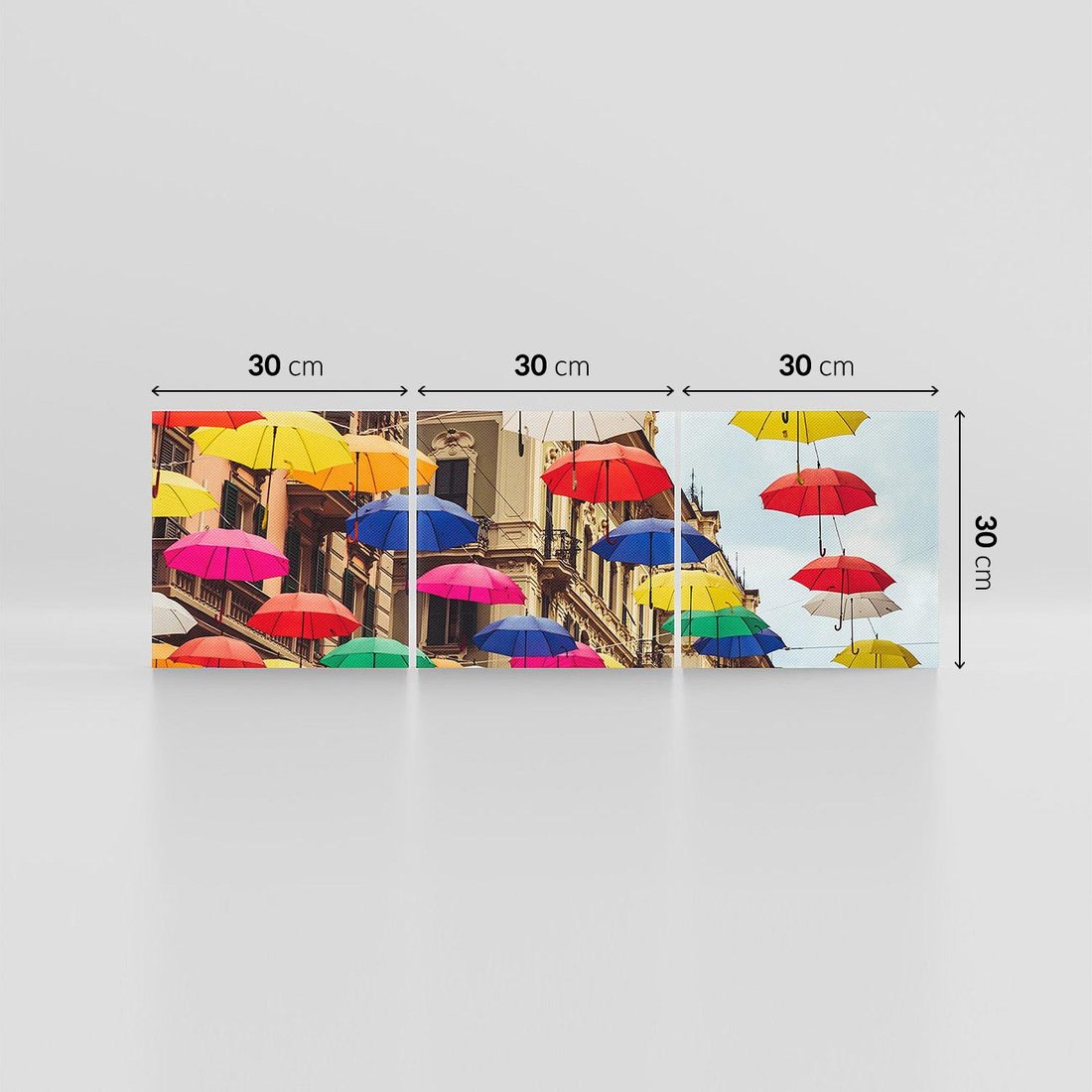 Obraz na płótnie 90x30 - Barwna symfonia wyobraźni - fotografia, kolorowe parasolki podwieszone nad ulicą