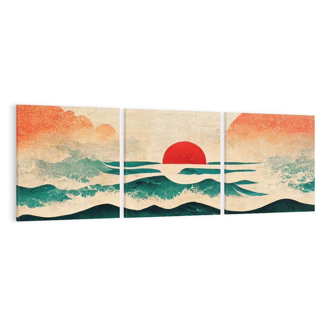 Japońska sztuka na płótnie, która przenosi nas w świat spokoju i harmonii. Widok zachodu słońca nad oceanem malowany na starym papirusie emanuje mistycznym urokiem. Styl japandi, charakteryzujący się minimalistycznym pięknem, doskonale współgra z dynamiką fal. Czerwone słońce nadaje obrazowi wyjątkowego nastroju, przenosząc nas w pejzaż dalekiej Japonii. To dzieło sztuki, które oczarowuje i zachwyca.