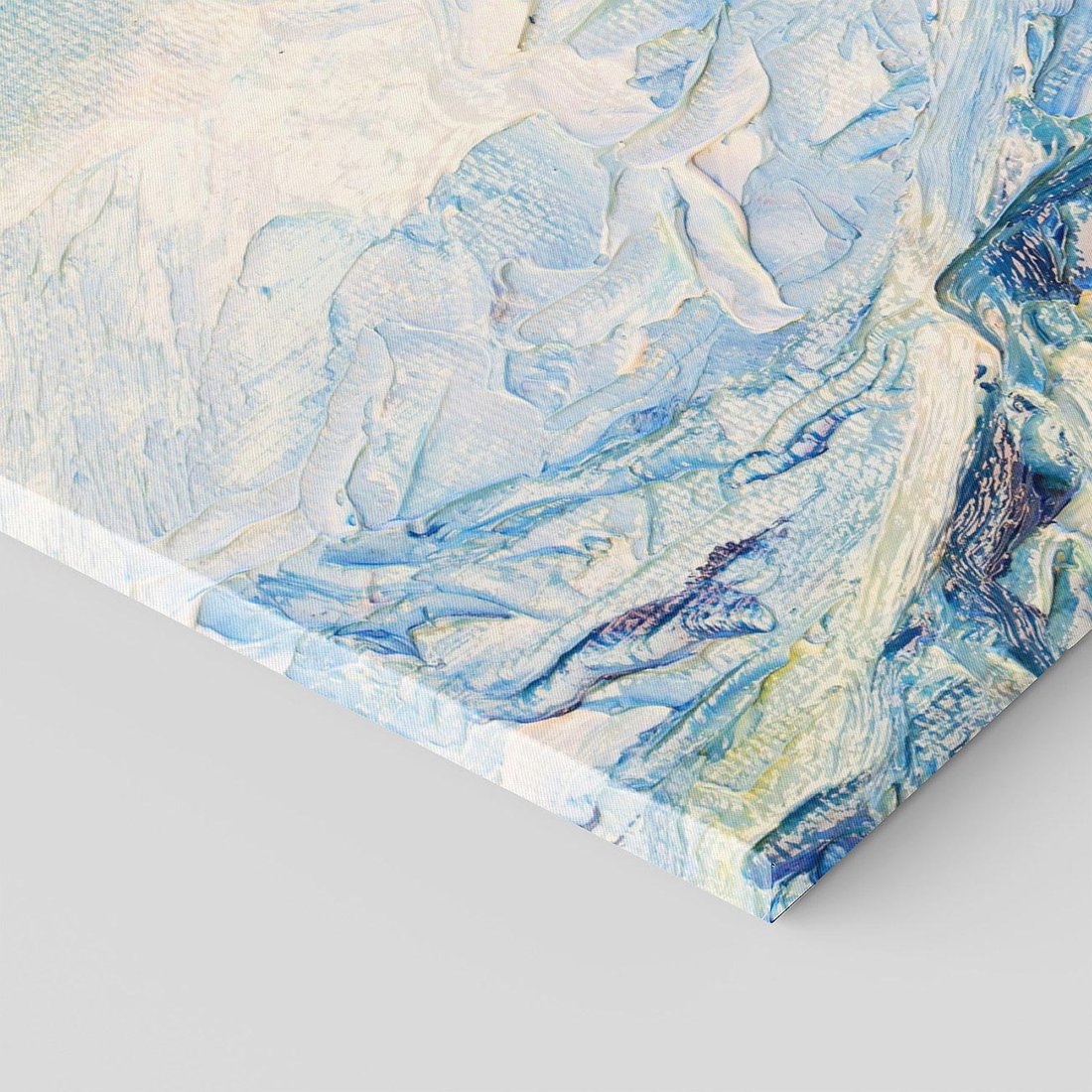 Ten olejny obraz ukazuje górski pejzaż z ośnieżoną górą, która wznosi się ponad malowniczą krainą. Błękity dominujące w kompozycji podkreślają spokój i majestat natury. "Majestat Błękitnych Szczytów" przenosi nas w piękno alpejskiej krainy, gdzie błękitne odcienie nieba i śniegu tworzą niesamowitą atmosferę i przestrzeń.