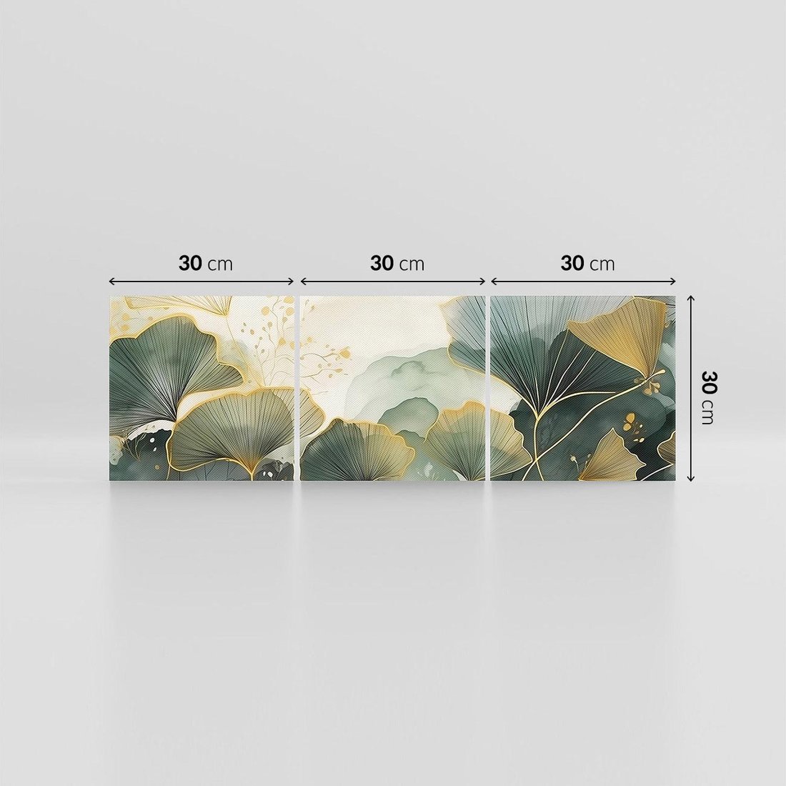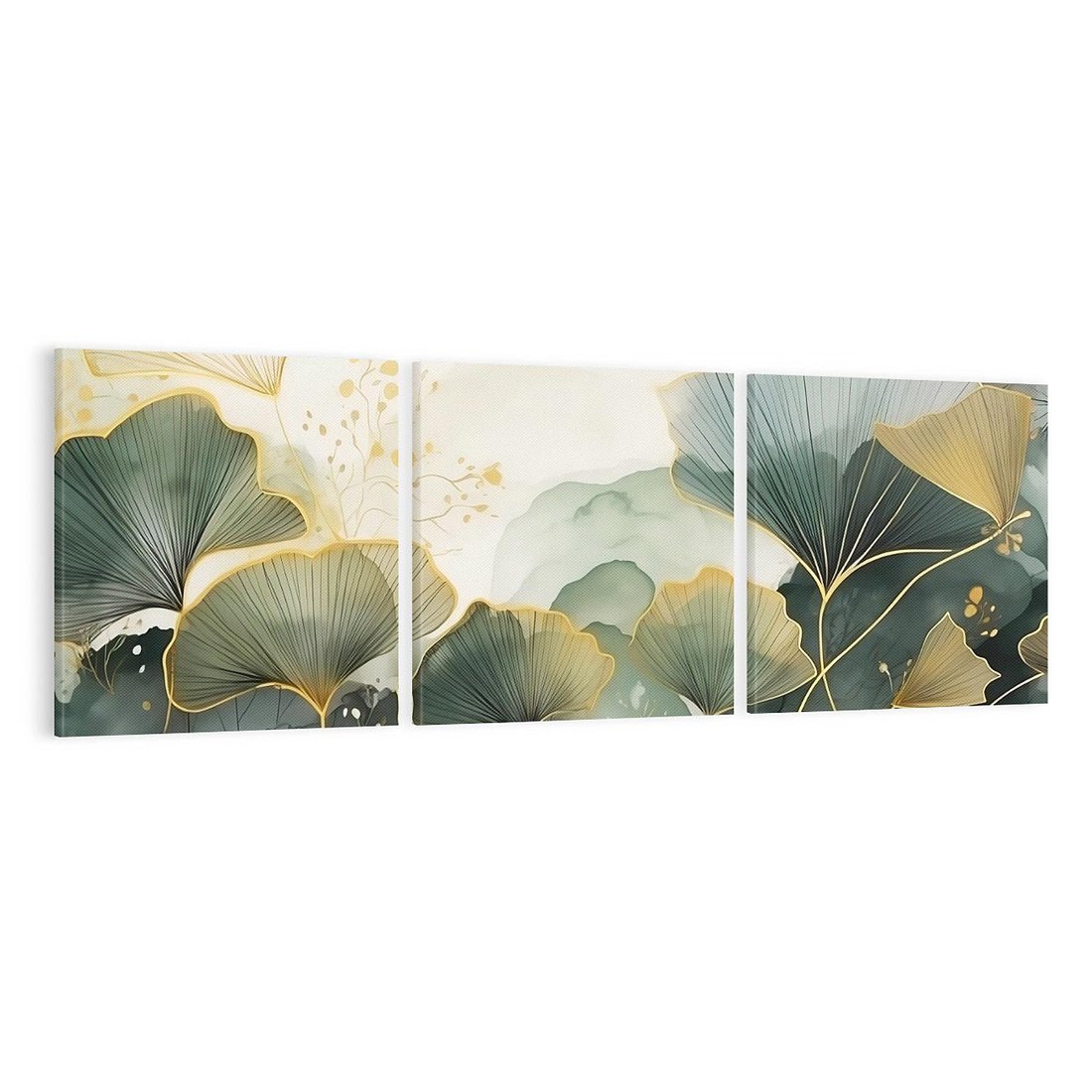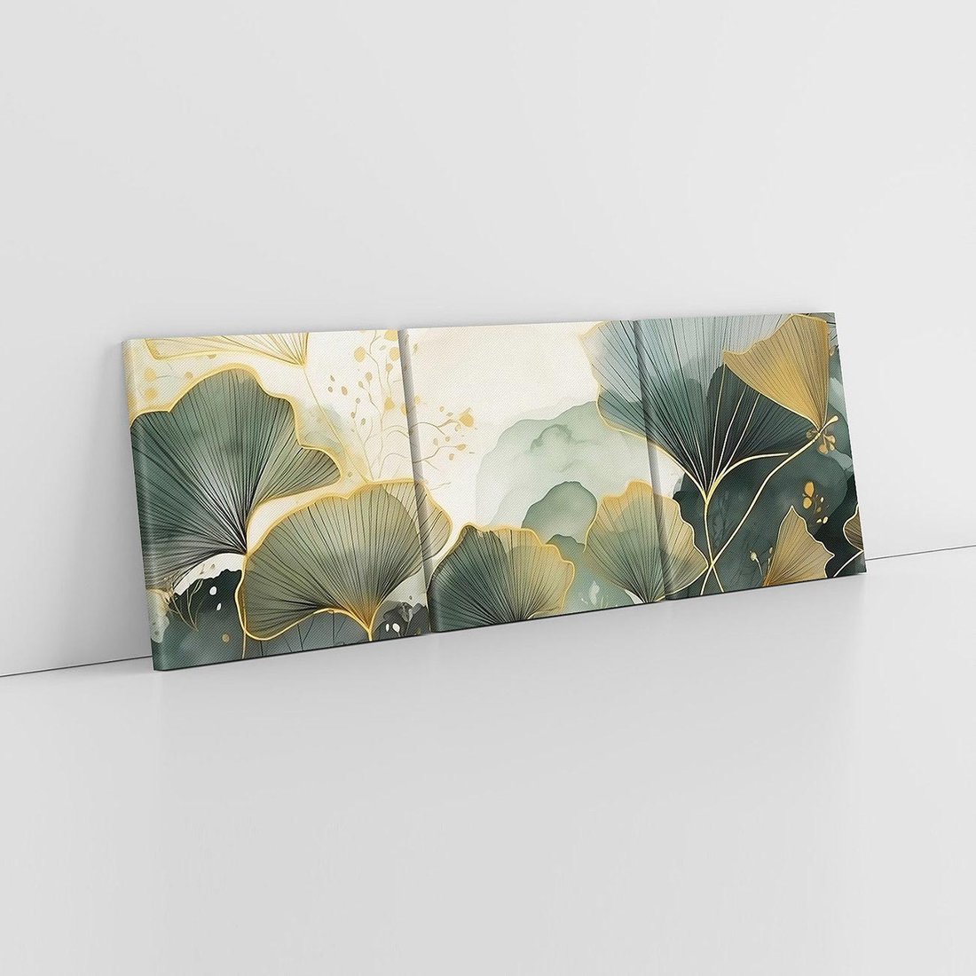 Ten malowniczy obraz przedstawia liście miłorzębu japońskiego w zgaszonej zielonej tonacji, z pięknym akwarelowym efektem. Złote elementy dodają subtelnej elegancji, nadając kompozycji wyjątkowego uroku. To artystyczne dzieło sztuki wprowadzi wspaniały akcent natury do Twojego wnętrza, zachwycając oryginalnością i delikatnością.