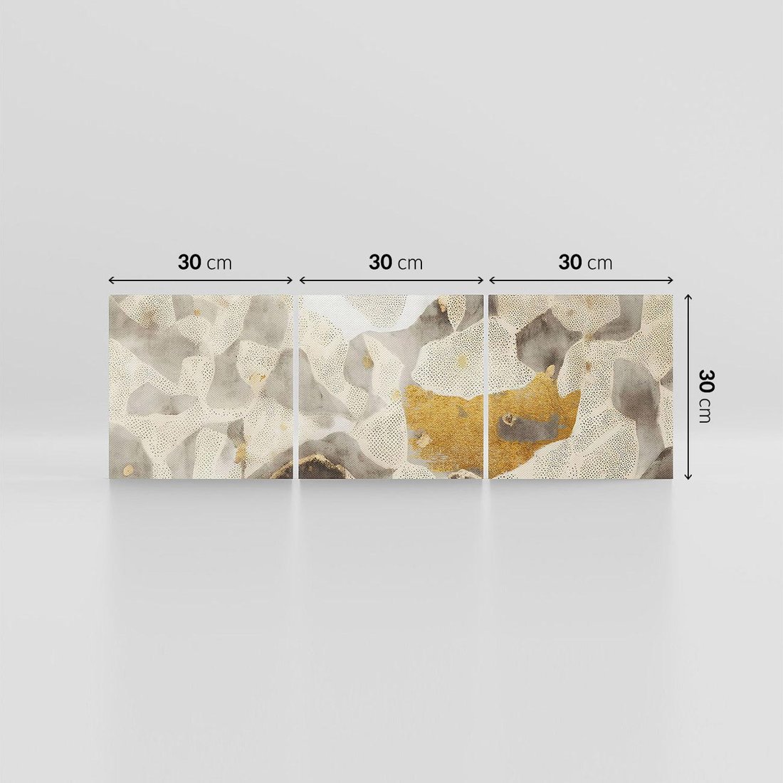 Ten nowoczesny obraz o charakterze glamour przedstawia złote i beżowe plamy, tworząc abstrakcyjne formy. Szarość dodaje elegancji i głębi kompozycji. To wyjątkowe dzieło sztuki idealnie pasuje do nowoczesnych wnętrz, nadając im subtelny luksus i artystyczną atmosferę.