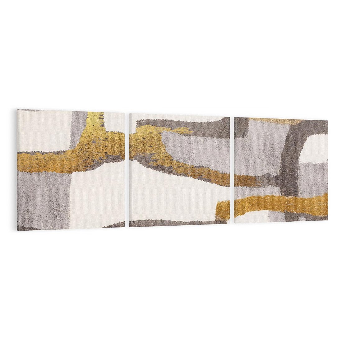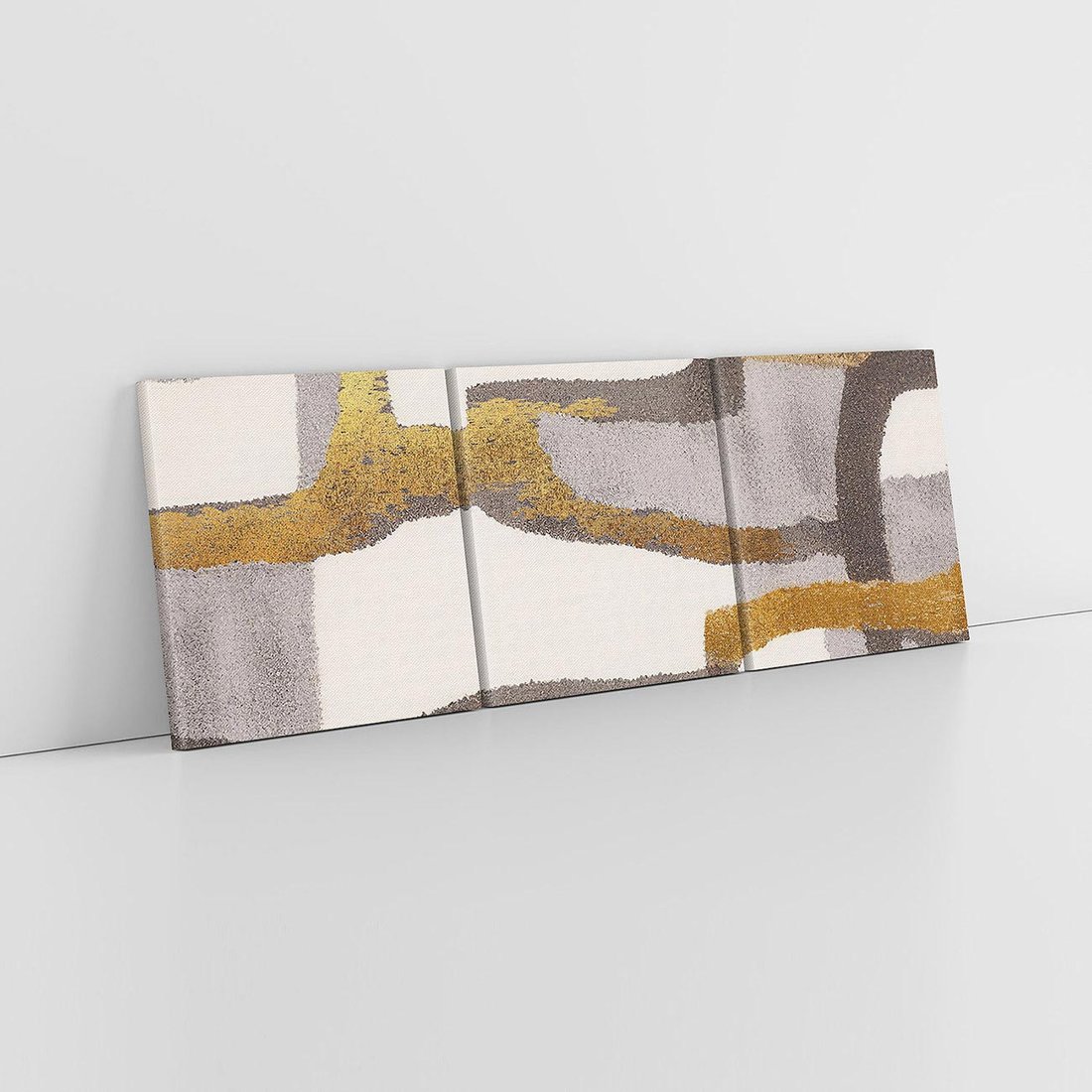 Odkryj głębię abstrakcji w tym obrazie na płótnie. Szerokie linie i złote detale są wyraźnie zarysowane na tle szarości, tworząc artystyczną wibrację, która ożywi każde pomieszczenie.