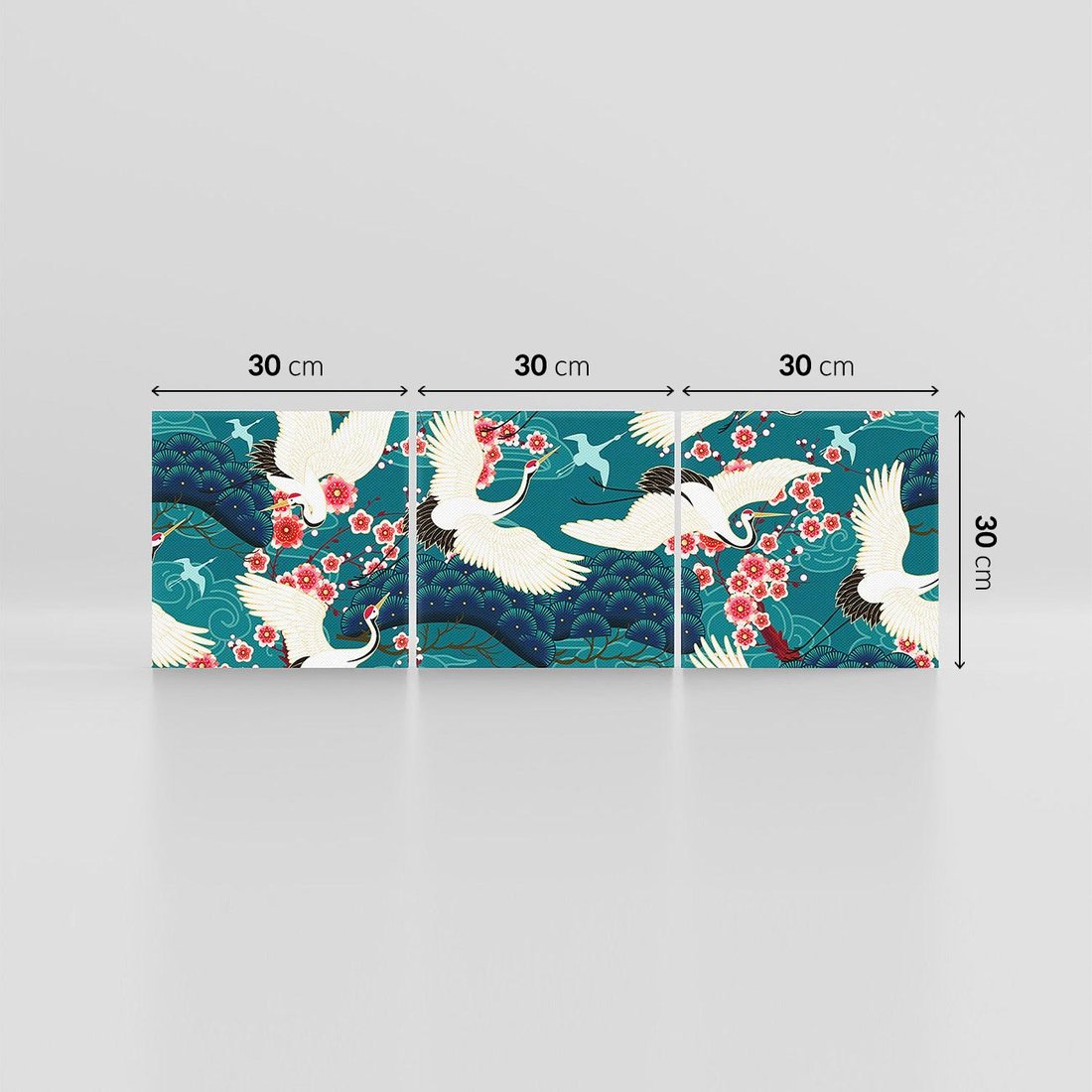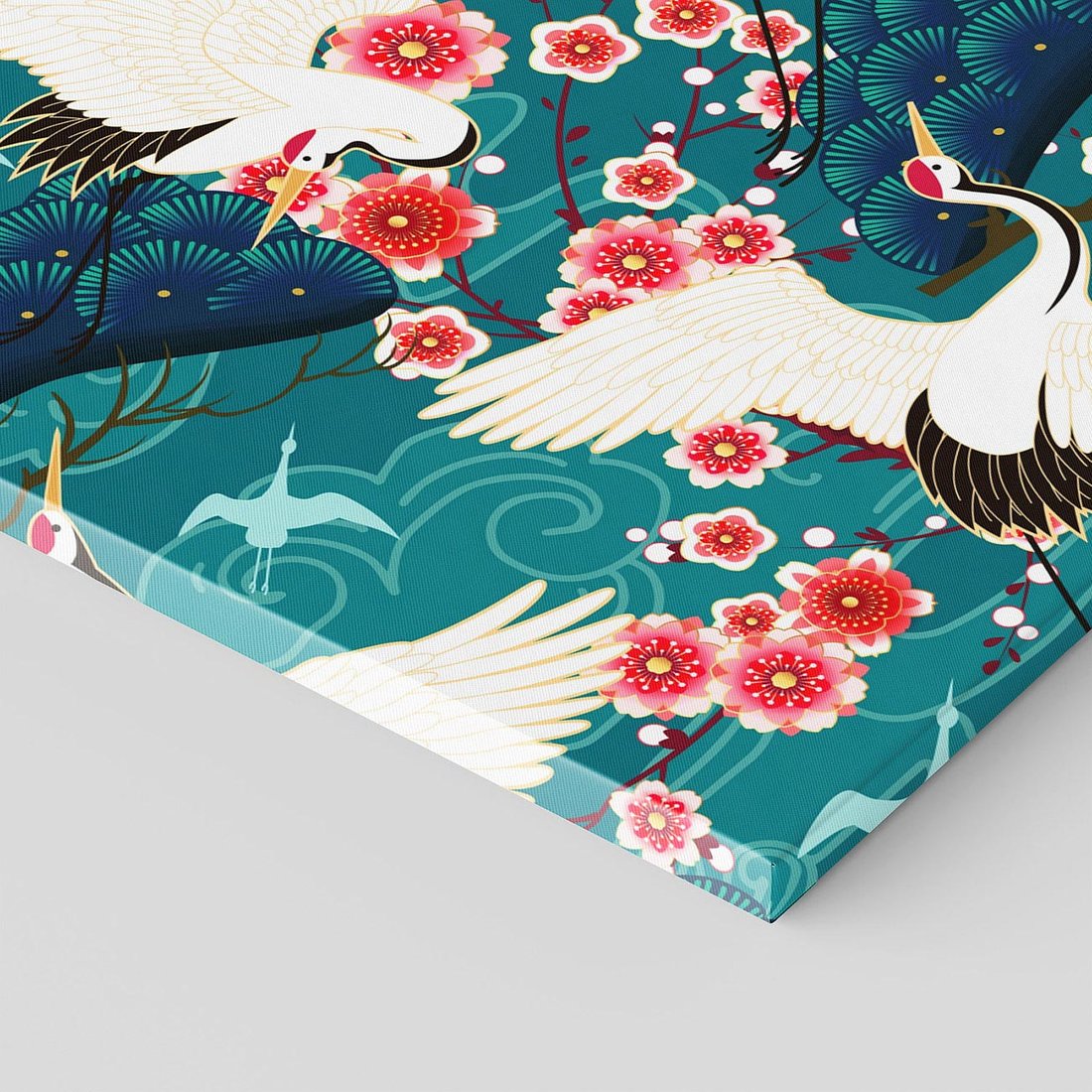 Grafika przedstawia orientalne japońskie żurawie lecące na turkusowym tle, w otoczeniu delikatnych kwiatów wiśni. Kształty wachlarzy dodają kompozycji elegancji. To artystyczne dzieło niesie ze sobą odrobinę dalekich kultur, przynosząc spokój i subtelny urok do wnętrza. Doskonałe do dekoracji w każdej przestrzeni.