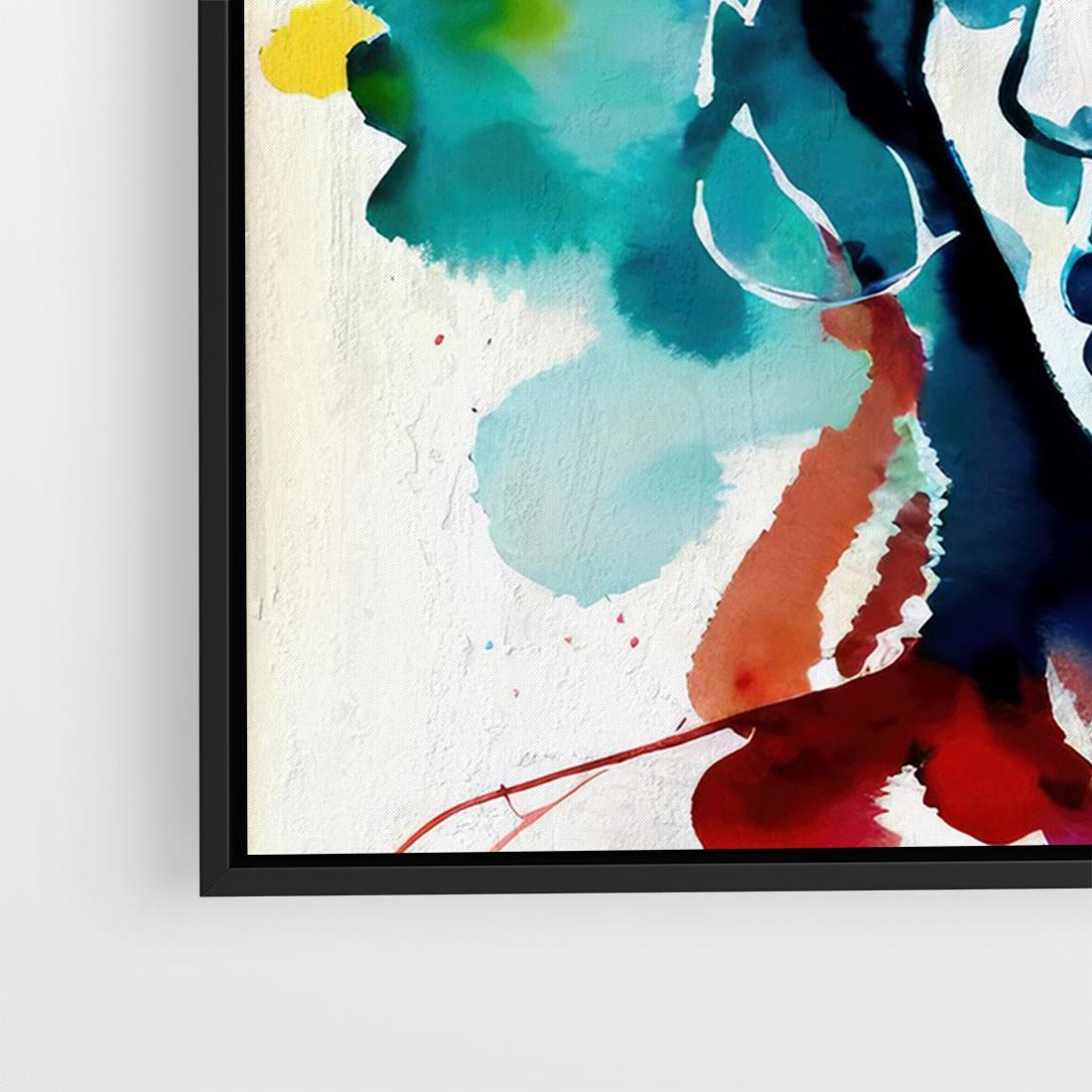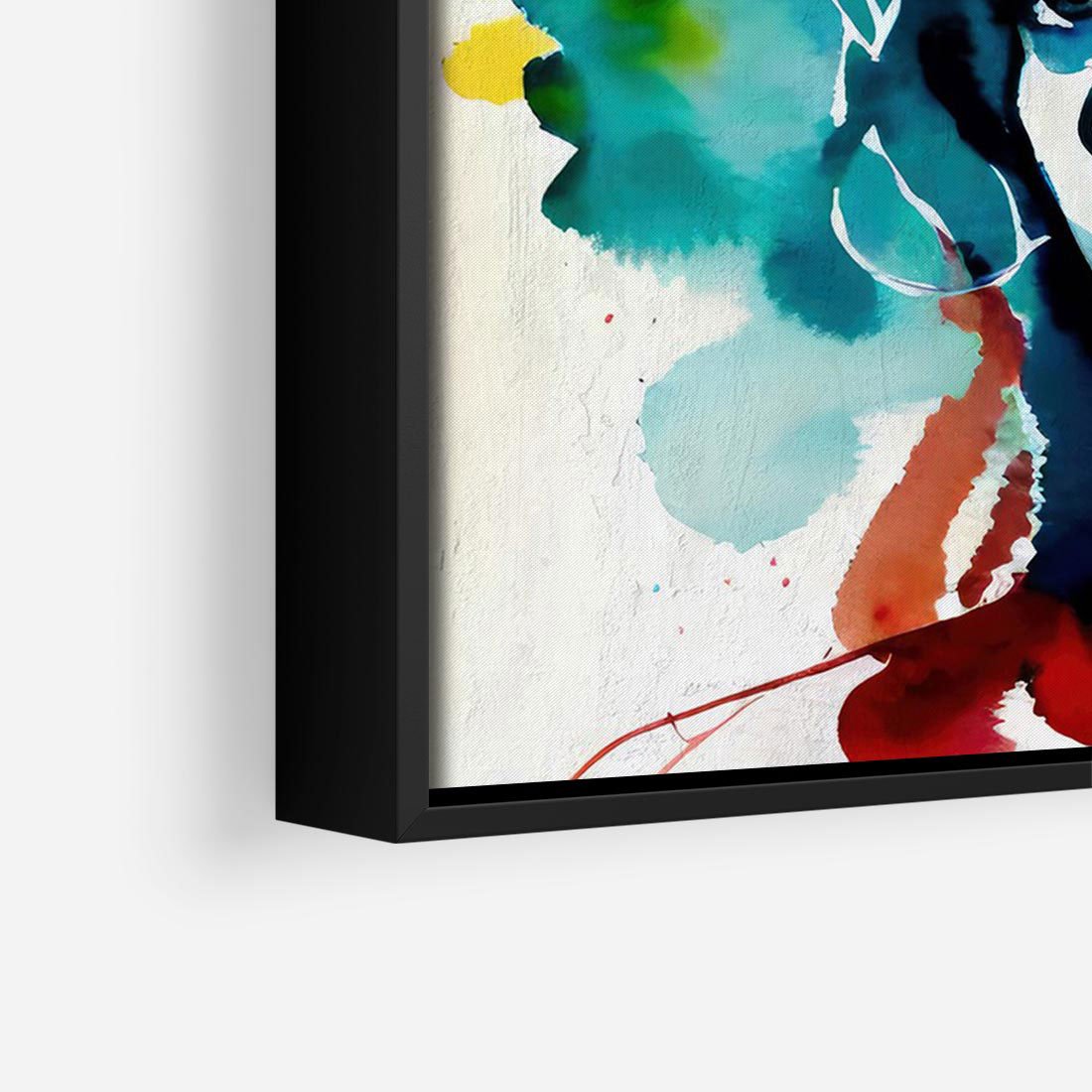 Czarna kreska w abstrakcyjnym portrecie kobiety jest delikatną osią, która kontrastuje z ekspresyjnymi akwarelowymi plamami rozpryśniętymi na płótnie. To zmysłowe połączenie wydobywa osobowość i emocje postaci , tworząc fascynujący taniec formy i koloru.