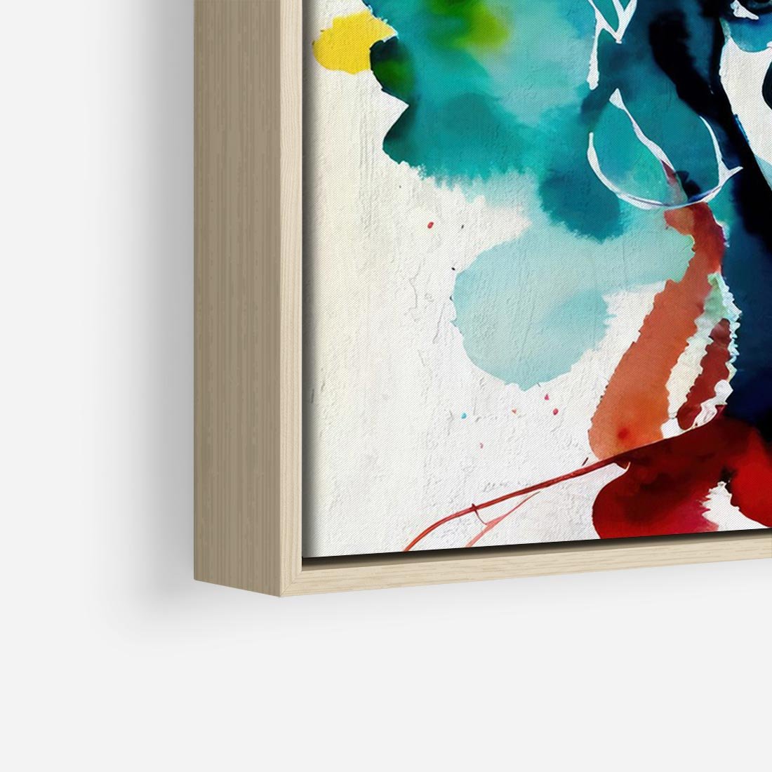 Czarna kreska w abstrakcyjnym portrecie kobiety jest delikatną osią, która kontrastuje z ekspresyjnymi akwarelowymi plamami rozpryśniętymi na płótnie. To zmysłowe połączenie wydobywa osobowość i emocje postaci , tworząc fascynujący taniec formy i koloru.