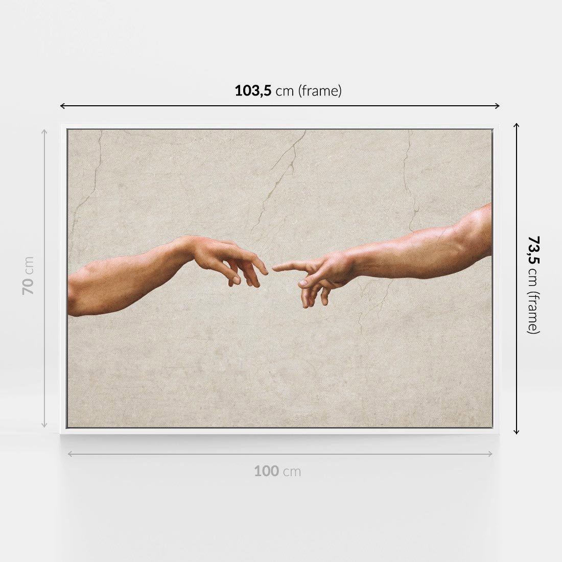 Ten wyjątkowy obraz stanowi hołd dla sztuki antyku i Michała Anioła. Ukazuje chwile Stworzenia Adama, gdzie ręka Boga dotyka ludzkiej dłoni. Wyrazista kompozycja i mistyczna atmosfera przyciągają wzrok i inspirują do refleksji nad siłą ducha i piękna boskiej twórczości.