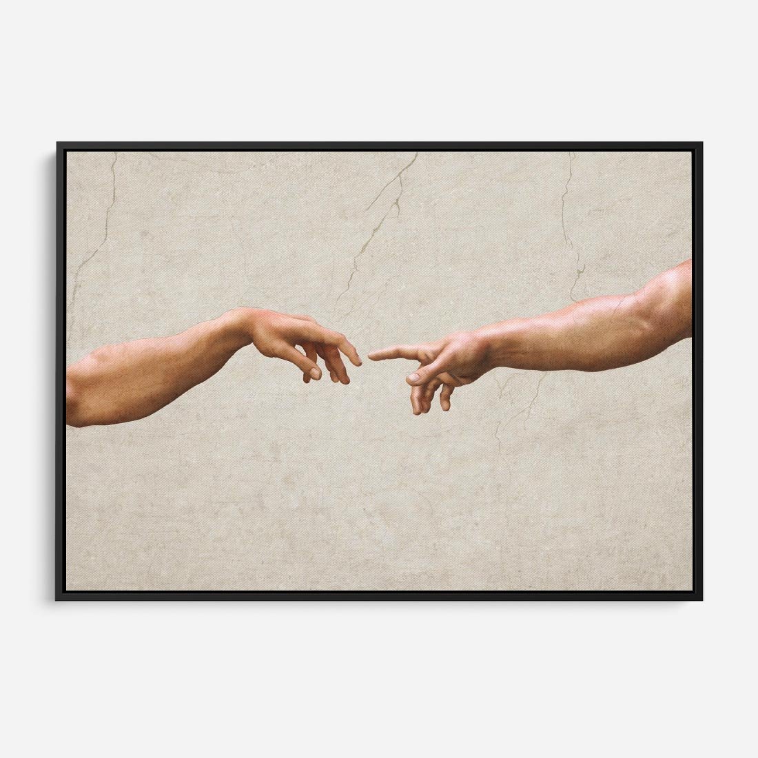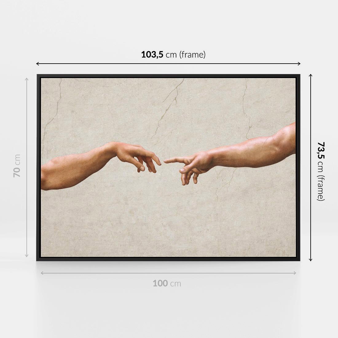 Ten wyjątkowy obraz stanowi hołd dla sztuki antyku i Michała Anioła. Ukazuje chwile Stworzenia Adama, gdzie ręka Boga dotyka ludzkiej dłoni. Wyrazista kompozycja i mistyczna atmosfera przyciągają wzrok i inspirują do refleksji nad siłą ducha i piękna boskiej twórczości.