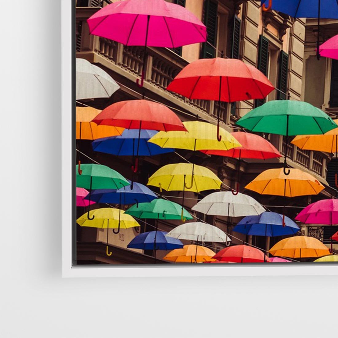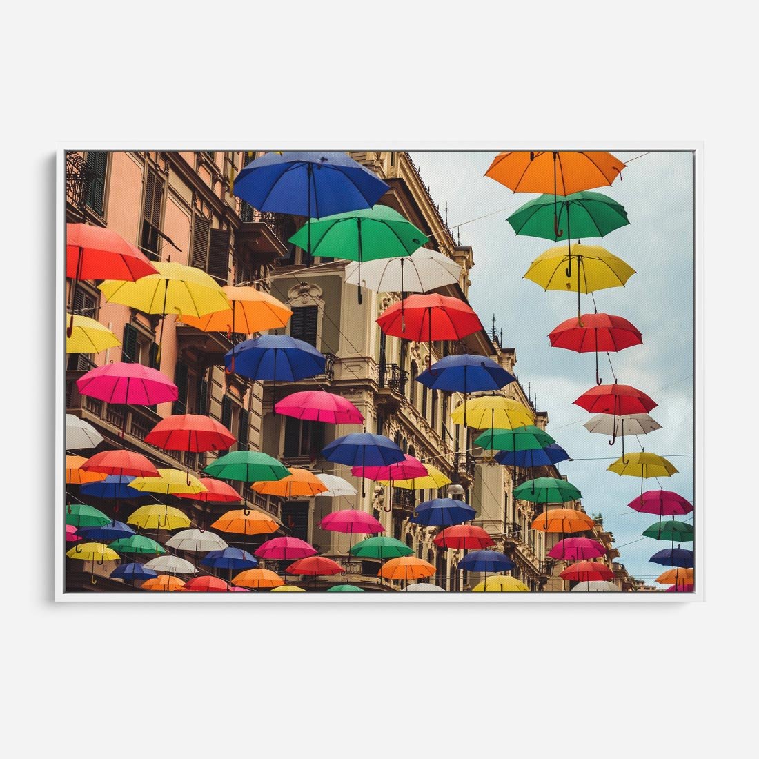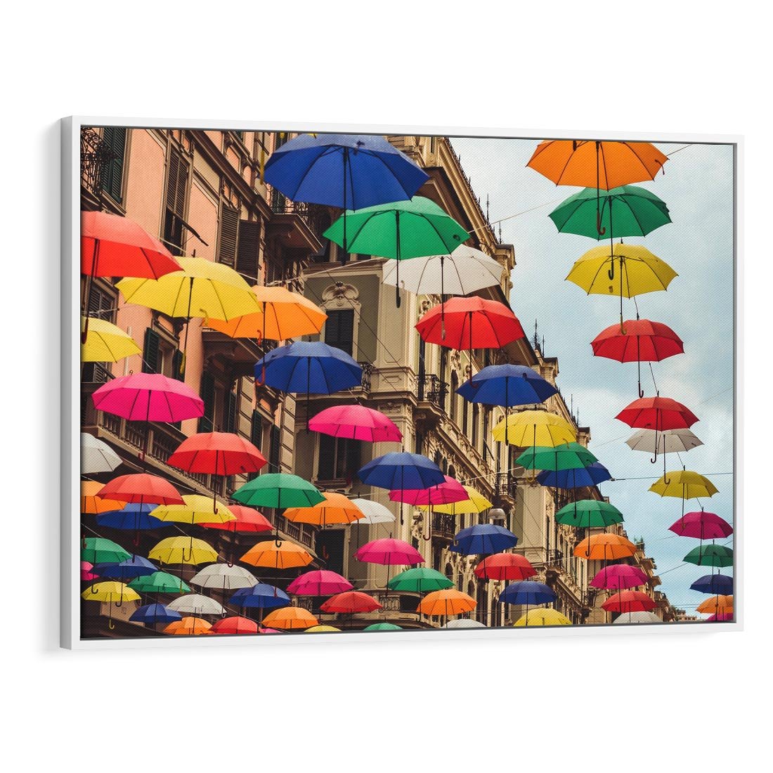 Obraz w ramie 100x70 - Barwna symfonia wyobraźni - fotografia, kolorowe parasolki podwieszone nad ulicą - rama biała