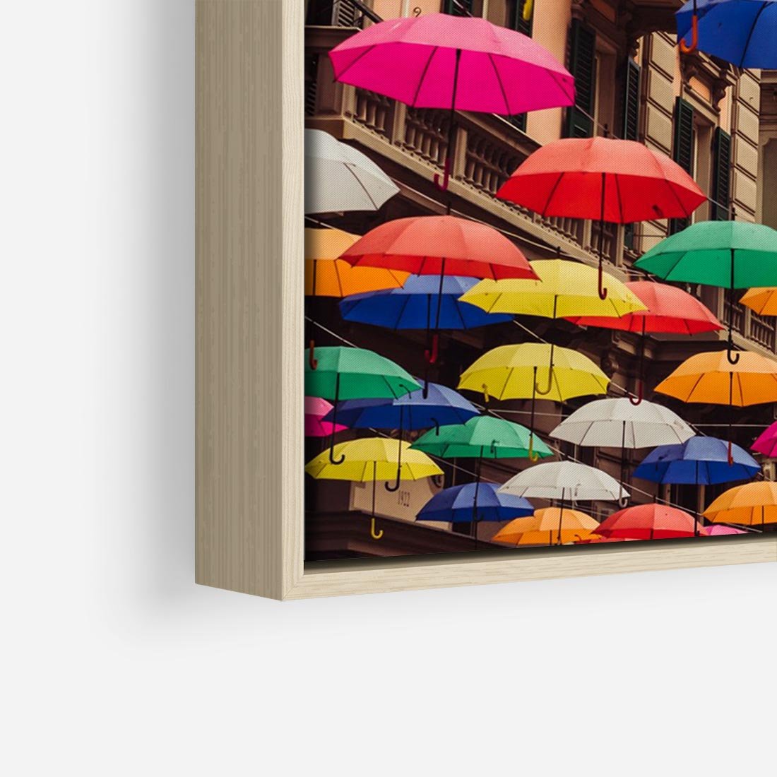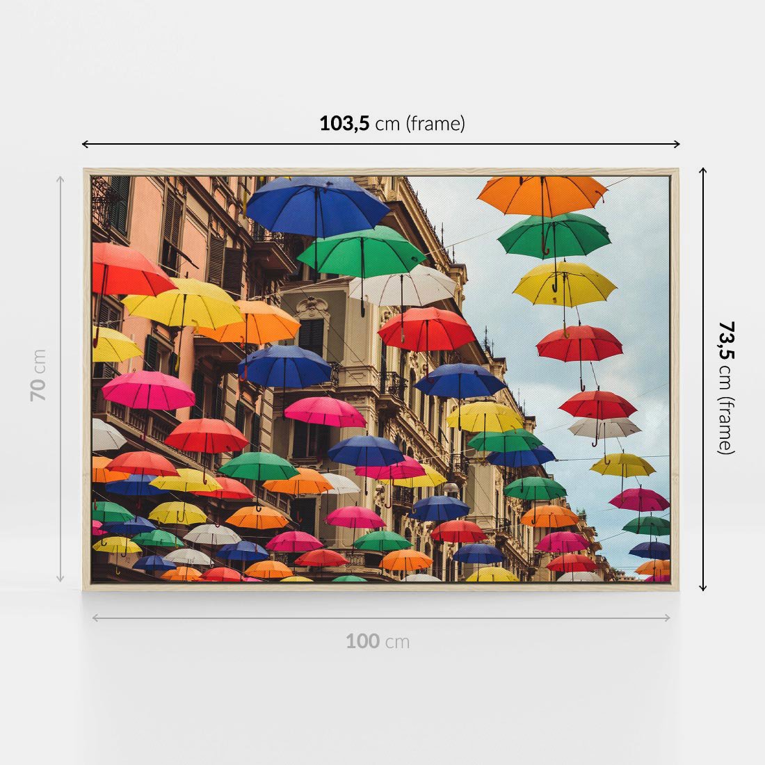 Obraz w ramie 100x70 - Barwna symfonia wyobraźni - fotografia, kolorowe parasolki podwieszone nad ulicą - rama drewno