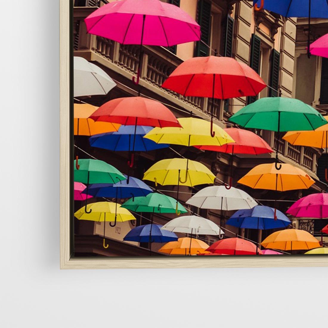 Fotografia ukazująca radosną scenę ulicy, gdzie kolorowe parasolki unoszą się nad głowami przechodniów. Ta tęczowa eksplozja kolorów tworzy niezapomnianą atmosferę, wprowadzając radość i życie do Twojego wnętrza. Te zatrzymane w kadrze chwile przypomną Ci o urokach codziennego życia.