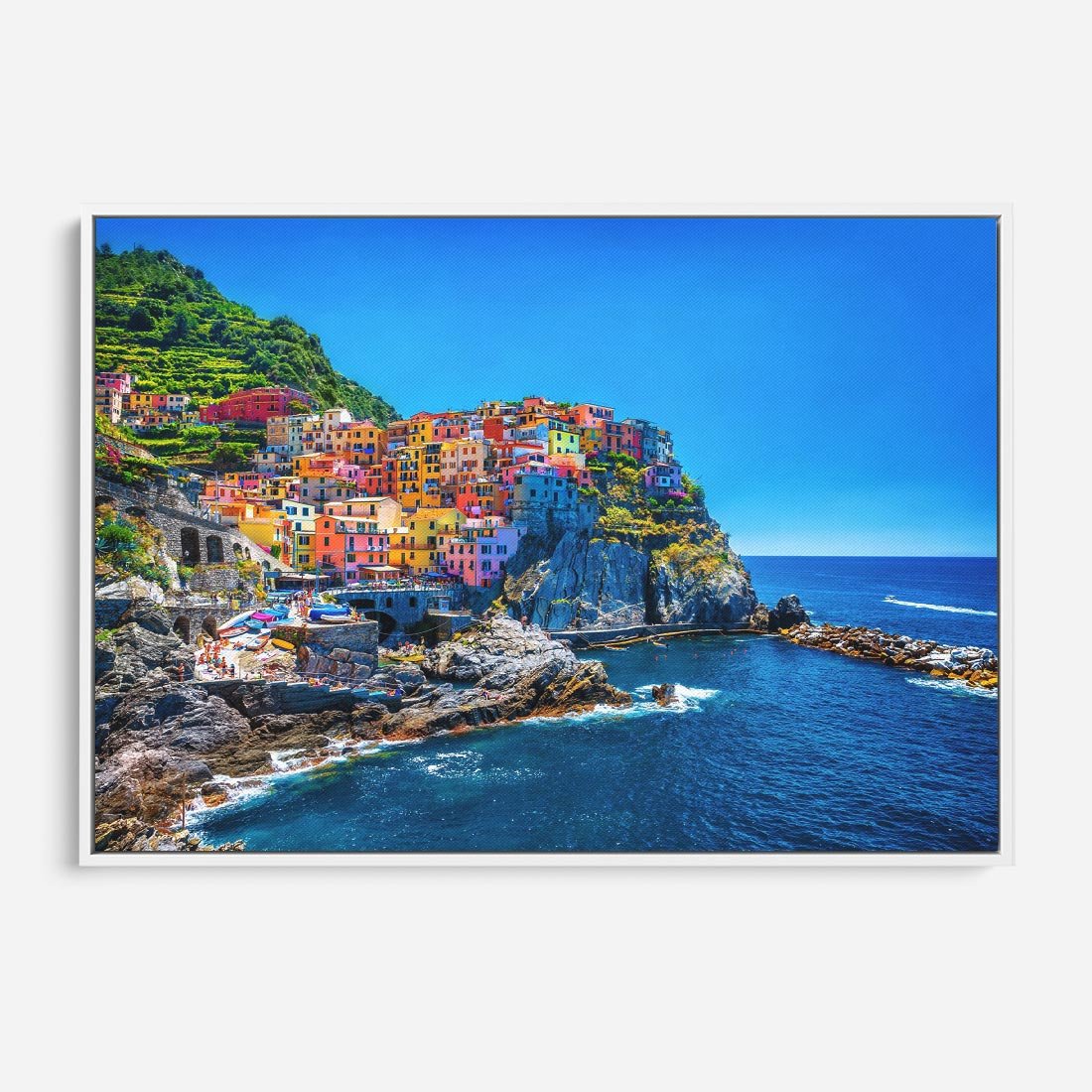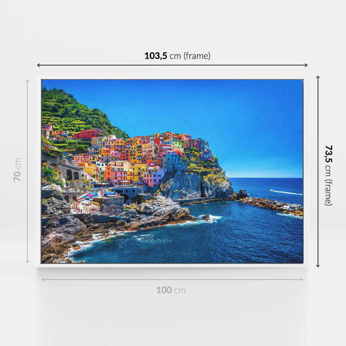 Obraz w ramie 100x70 - Barwne Wybrzeże - nadmorskie miasto na klifie, kolorowe tęczowe budynki - rama biała