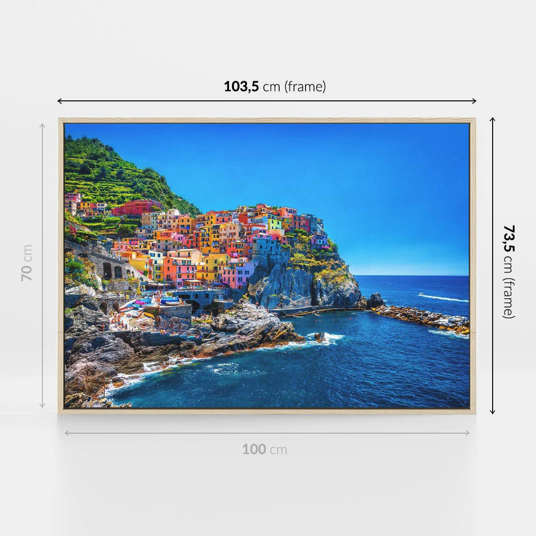 Obraz w ramie 100x70 - Barwne Wybrzeże - nadmorskie miasto na klifie, kolorowe tęczowe budynki - rama drewno