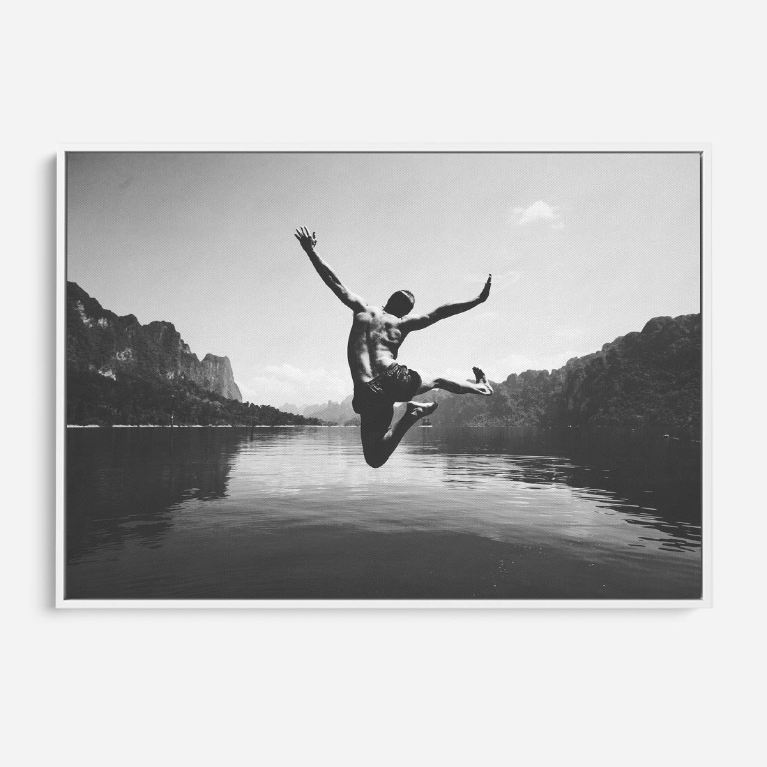 Obraz w ramie 100x70 - Beztroska Chwila - czarno biała fotografia, mężczyzna wesoło wskakuje do keziora w górach - rama biała