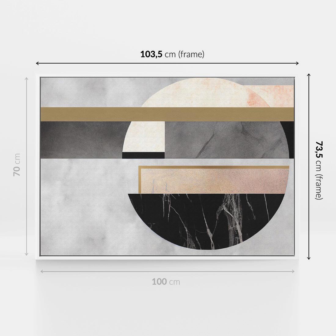 Unikalny obraz, który w nowoczesny sposób łączy geometrię, koła i tekstury szarego marmuru. Subtelne pastele w połączeniu z białymi i czarnymi formami tworzą harmonijną kompozycję, emanującą elegancją i spokojem. To wyjątkowe dzieło sztuki dodaje przestrzeni nowoczesności, zachęcając do odkrywania estetycznych detali.