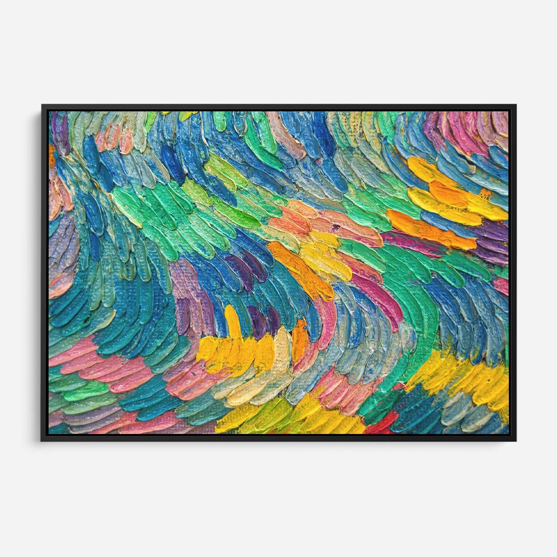 To abstrakcyjne dzieło sztuki przypominające egzotyczne pióra ptaka wzbudza wyobraźnię i zachwyca bogactwem tęczowych kolorów. Farby olejne zostały zastosowane z precyzją, by stworzyć teksturę przypominającą pióra. Obraz emanuje tajemniczością i pięknem natury, idealny dla miłośników egzotycznych krajobrazów i sztuki abstrakcyjnej.