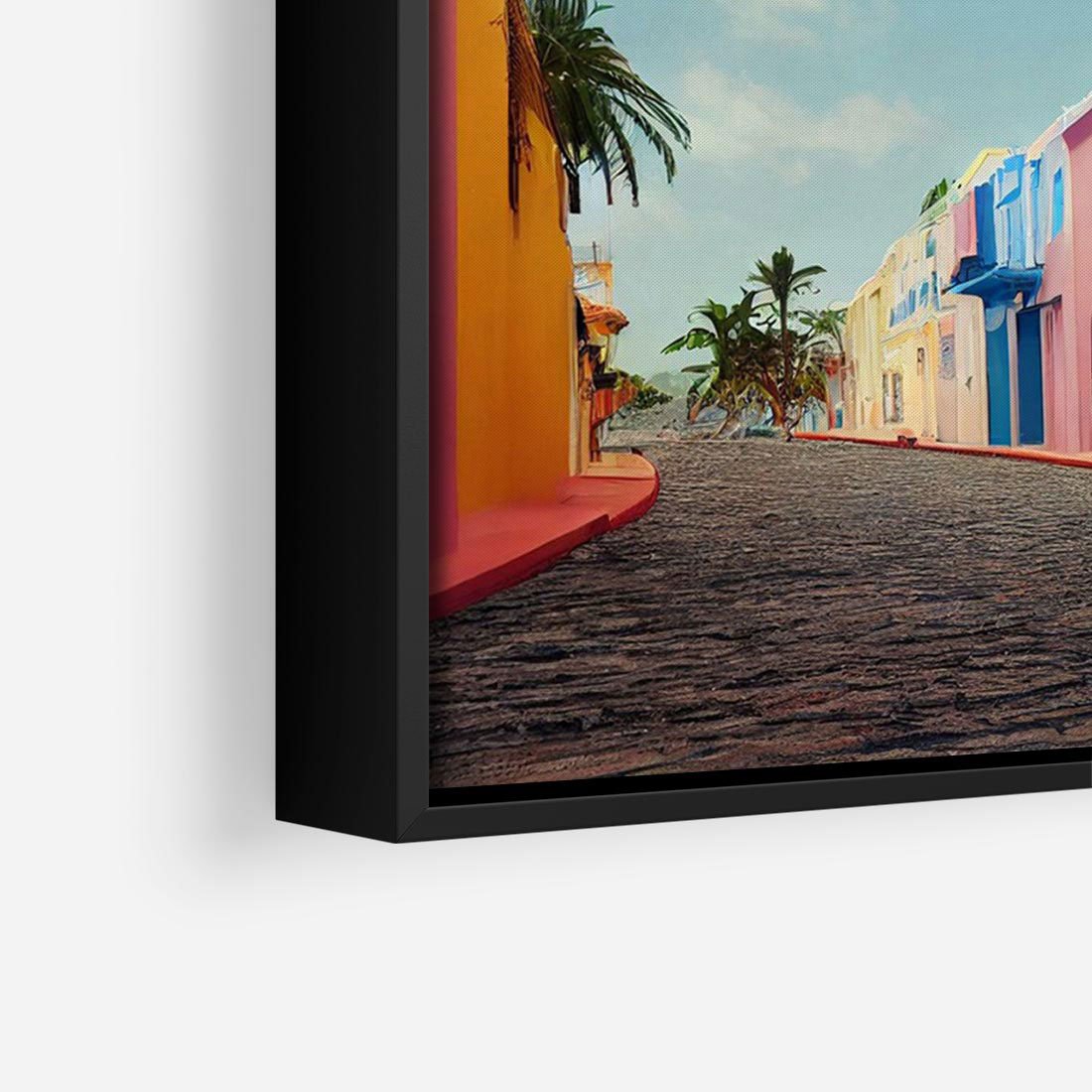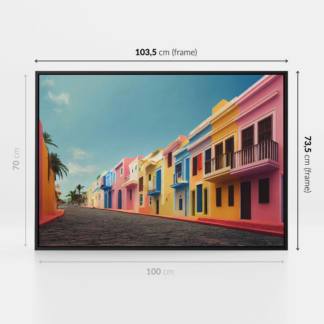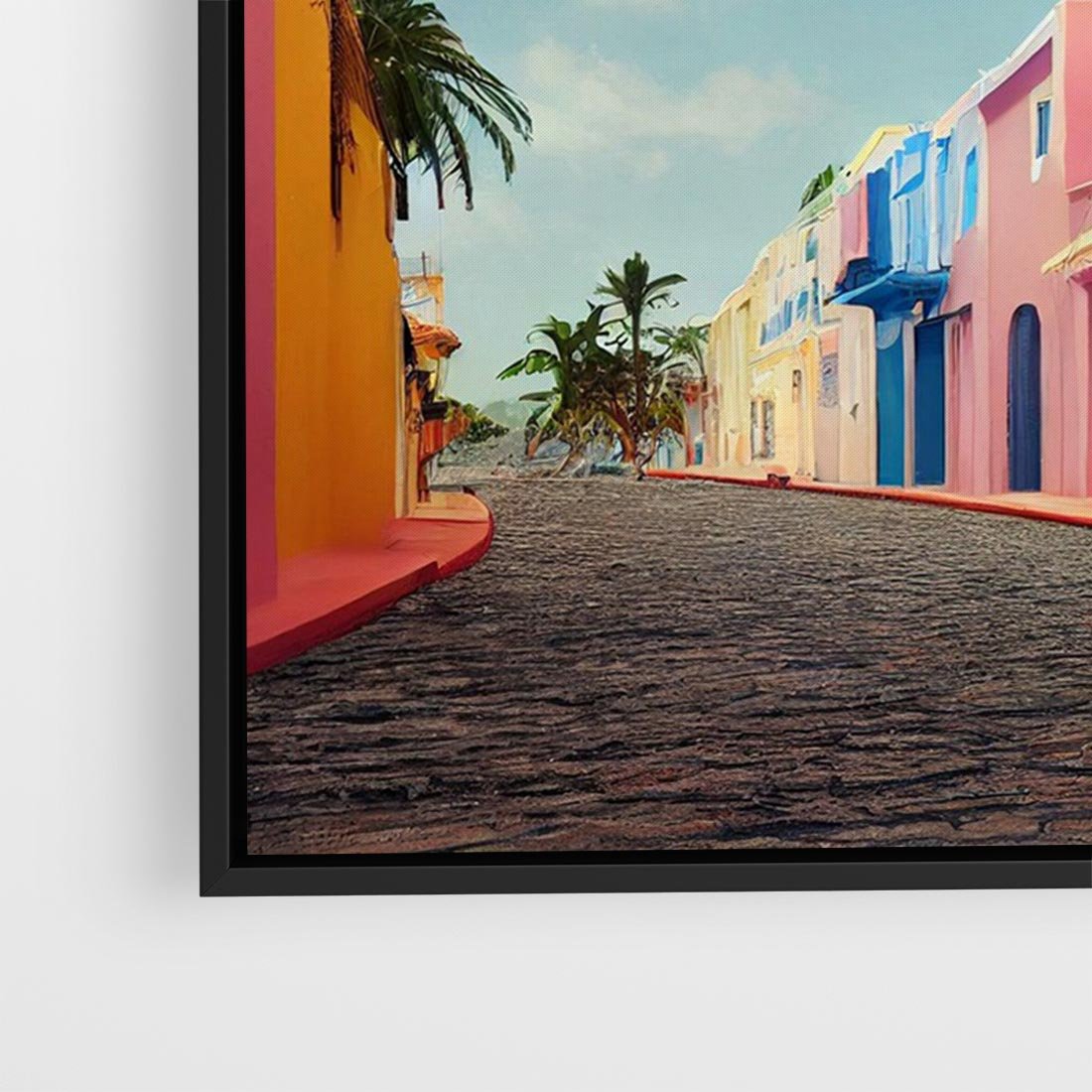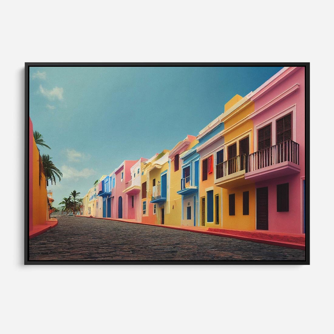 Obraz w ramie 100x70 - Ekspresja marzeń i tęsknot - pastelowe kolorowe budynki, wzdłuż ulicy - rama czarna