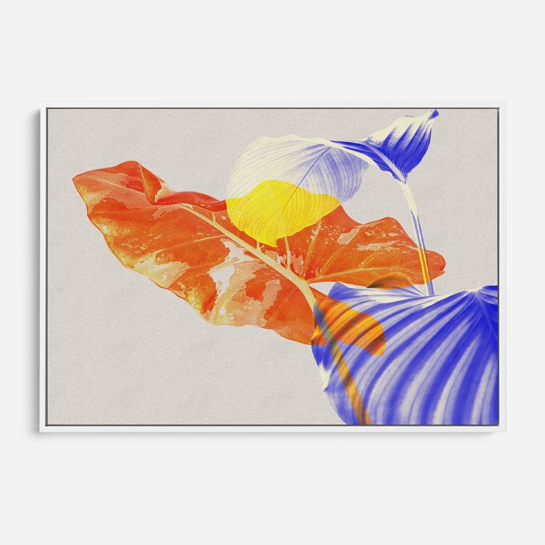 Obraz w stylu retro przedstawia tropikalne liście w energetycznych kolorach indygo i pomarańczu. Kompozycja emanuje radością i świeżością, przyciągając wzrok swoimi tropikalnymi motywami i wyrazistymi kolorami. Idealne dzieło sztuki, aby dodać wnętrzom wyjątkowej atmosfery i pozytywnej energii.