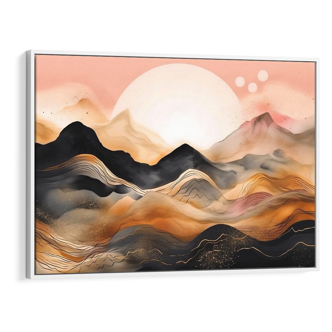 Ta nowoczesna grafika ukazuje urok zachodu słońca nad czarnymi górami. Odcienie pastelowego różu i złota tworzą magiczną atmosferę, przenosząc widza w malowniczy krajobraz. To artystyczne dzieło oddaje piękno natury i wprowadzi harmonię oraz ciepło do każdego wnętrza.