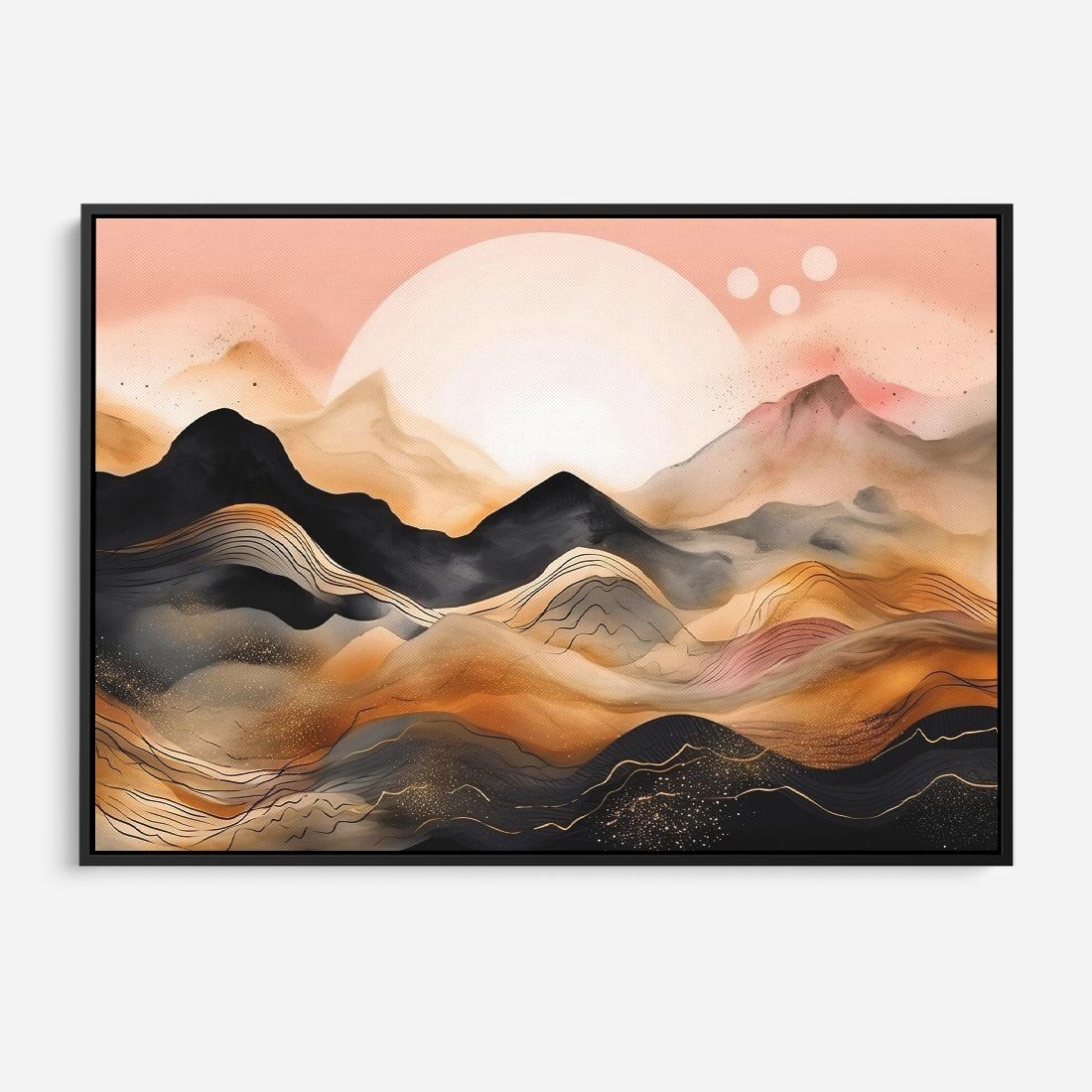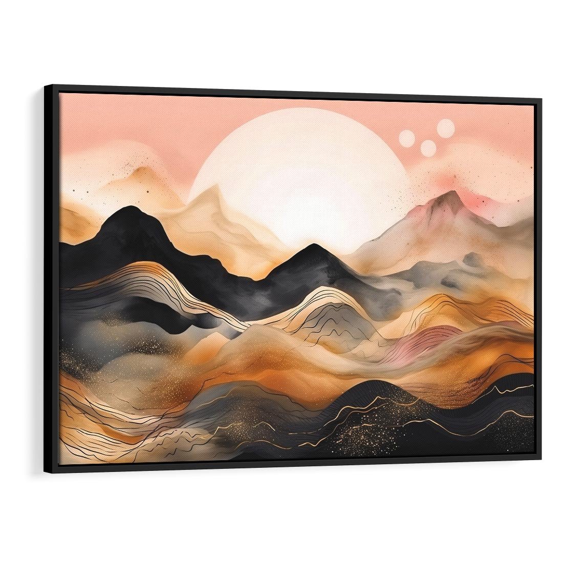 Ta nowoczesna grafika ukazuje urok zachodu słońca nad czarnymi górami. Odcienie pastelowego różu i złota tworzą magiczną atmosferę, przenosząc widza w malowniczy krajobraz. To artystyczne dzieło oddaje piękno natury i wprowadzi harmonię oraz ciepło do każdego wnętrza.
