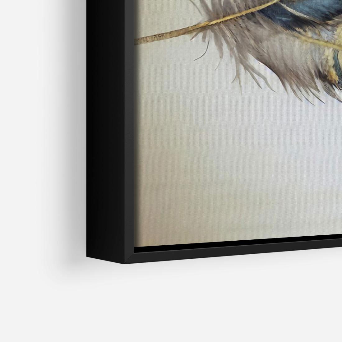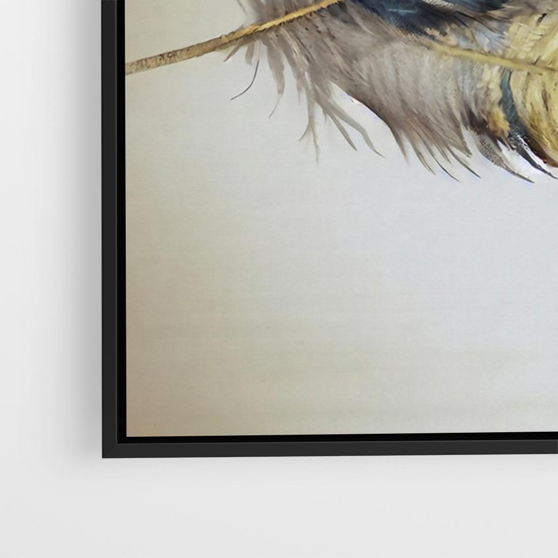 Ten unikatowy obraz przedstawia granatowe i złote pióra w stylu boho. Sztuka ta emanuje swobodą i egzotycznym wdziękiem, przyciągając wzrok swoją oryginalnością. Wyraziste kolory i piękno piór wkomponowane w dzieło sztuki dodają przestrzeni wyjątkowego charakteru i artystycznego stylu, idealnego dla miłośników boho.