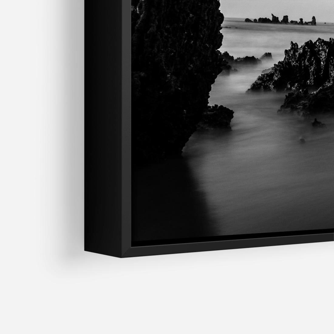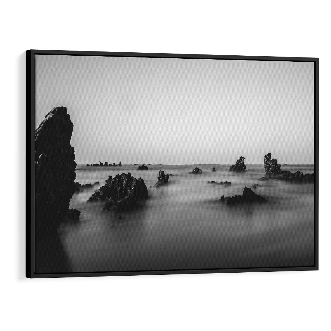Obraz w ramie 100x70 - Harmonia świateł i cieni - zamglona dzika plaża, skały na plaży - rama czarna