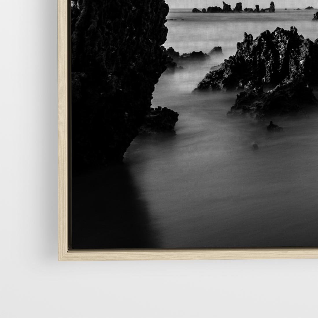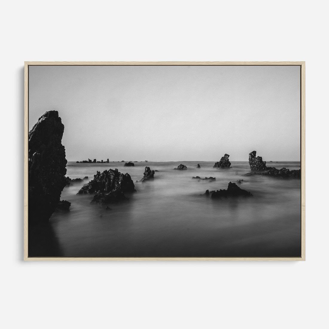 Ta czarno-biała fotografia ukazuje dziką i tajemniczą plażę, gdzie mroczny klimat przeplata się z tajemniczą atmosferą. Skały na brzegu dodają dramatyczności, a zamglony widok dodaje aurze tajemnicy. To pejzaż, który przenosi nas w świat ukrytych historii i nieodkrytych sekretów natury, zapraszając nas do kontemplacji i marzeń.