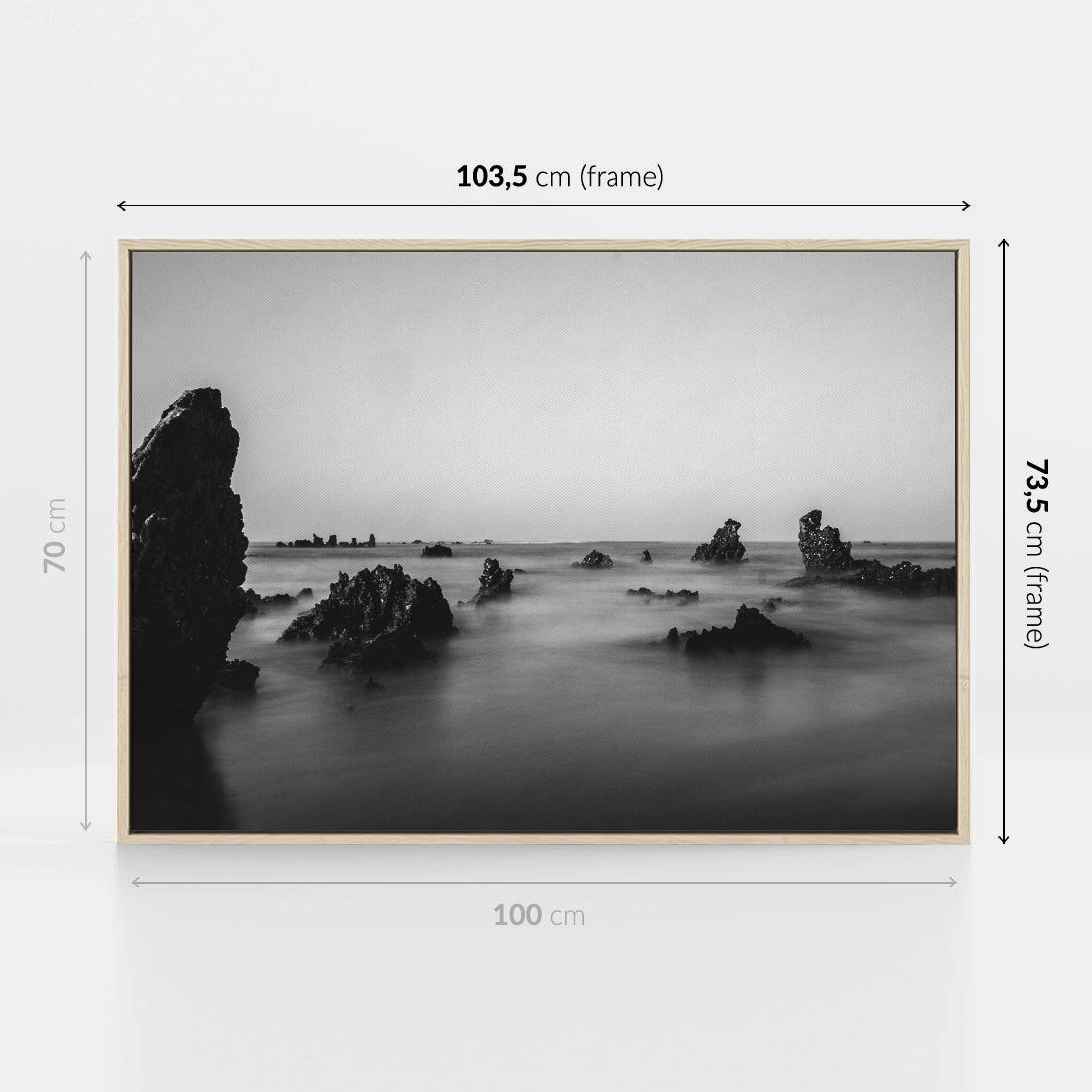 Obraz w ramie 100x70 - Harmonia świateł i cieni - zamglona dzika plaża, skały na plaży - rama drewno