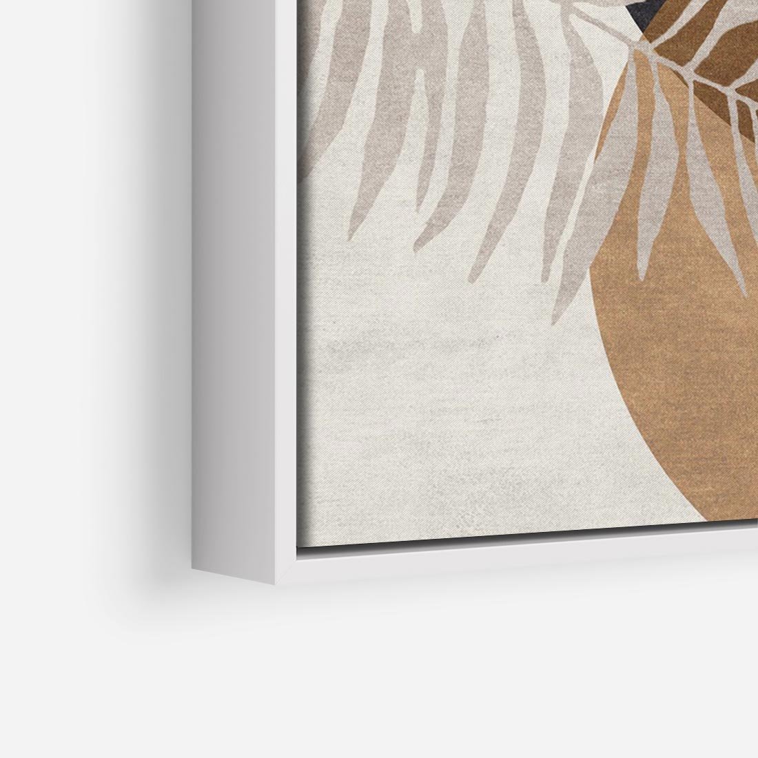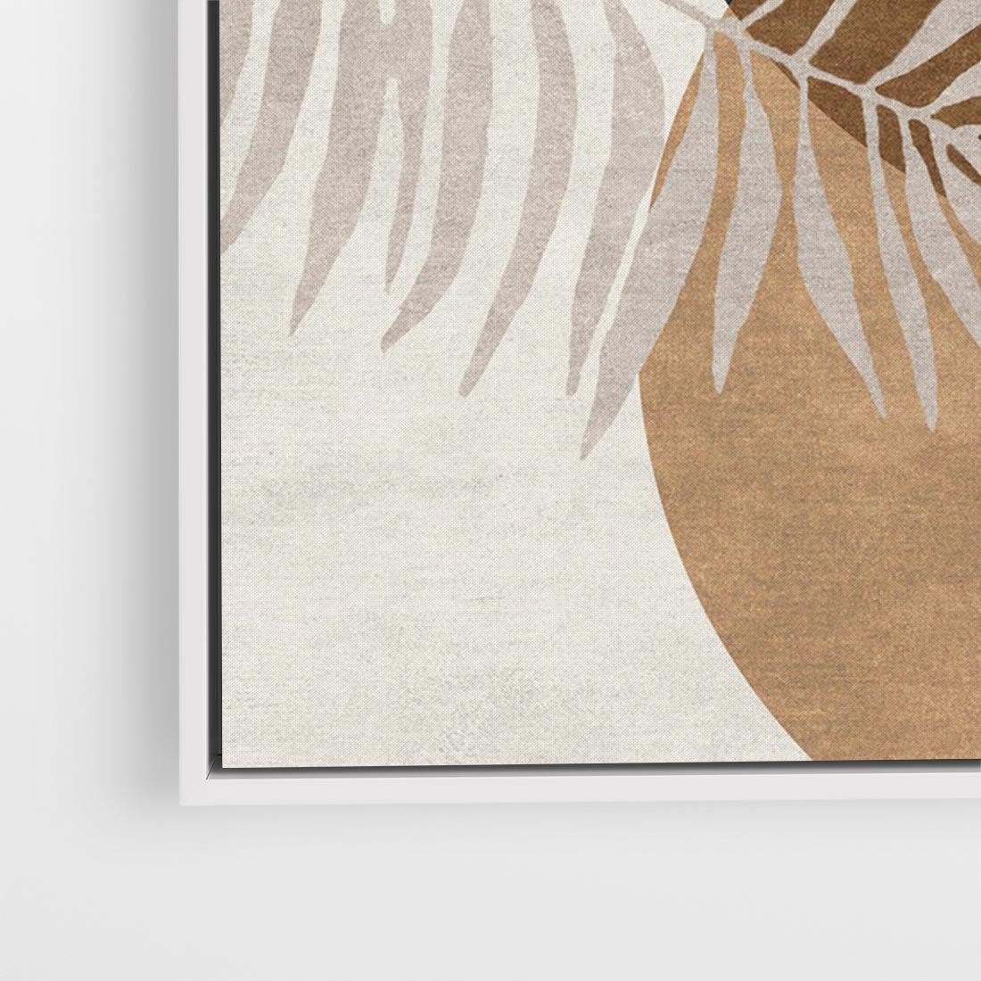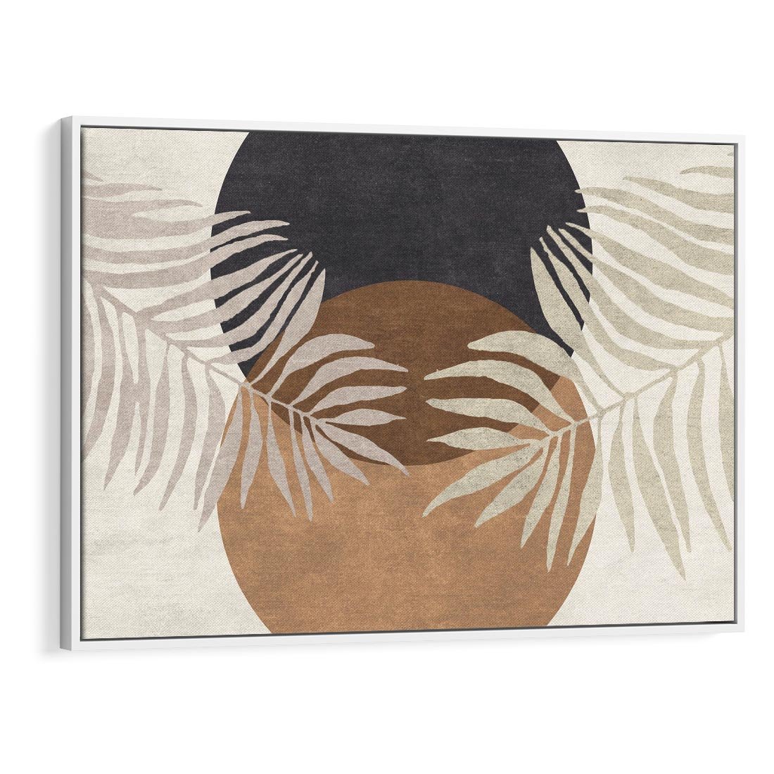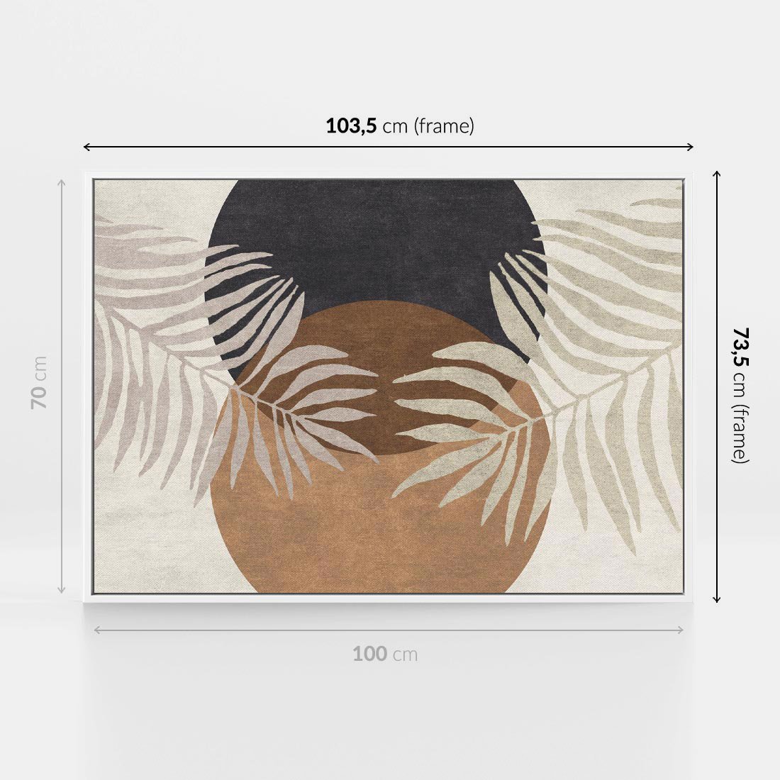 Odkryj wyjątkowy obraz w stylu boho, gdzie symetria i dwa duże koła po środku przyciągają uwagę. Brąz i czerń tworzą elegancką paletę barw. Po bokach umieszczone są delikatne liście palmy, dodające tropikalnego uroku. To dzieło sztuki stworzone dla miłośników stylu boho, którzy pragną wnieść artystyczną duszę do swoich wnętrz.