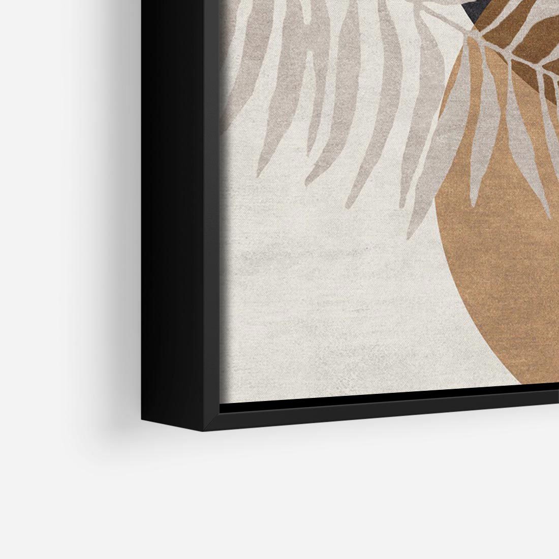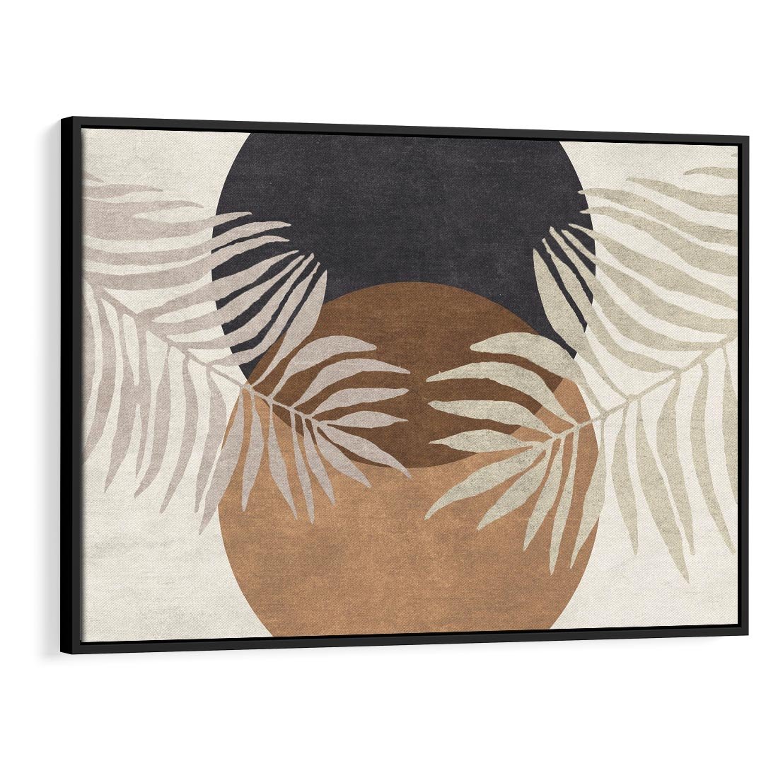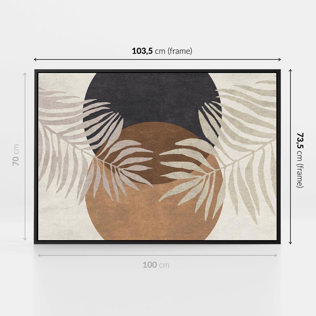 Odkryj wyjątkowy obraz w stylu boho, gdzie symetria i dwa duże koła po środku przyciągają uwagę. Brąz i czerń tworzą elegancką paletę barw. Po bokach umieszczone są delikatne liście palmy, dodające tropikalnego uroku. To dzieło sztuki stworzone dla miłośników stylu boho, którzy pragną wnieść artystyczną duszę do swoich wnętrz.