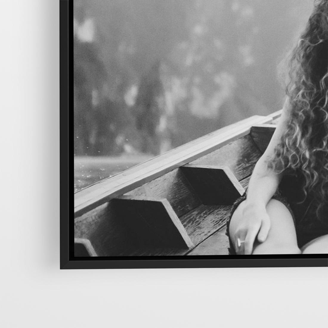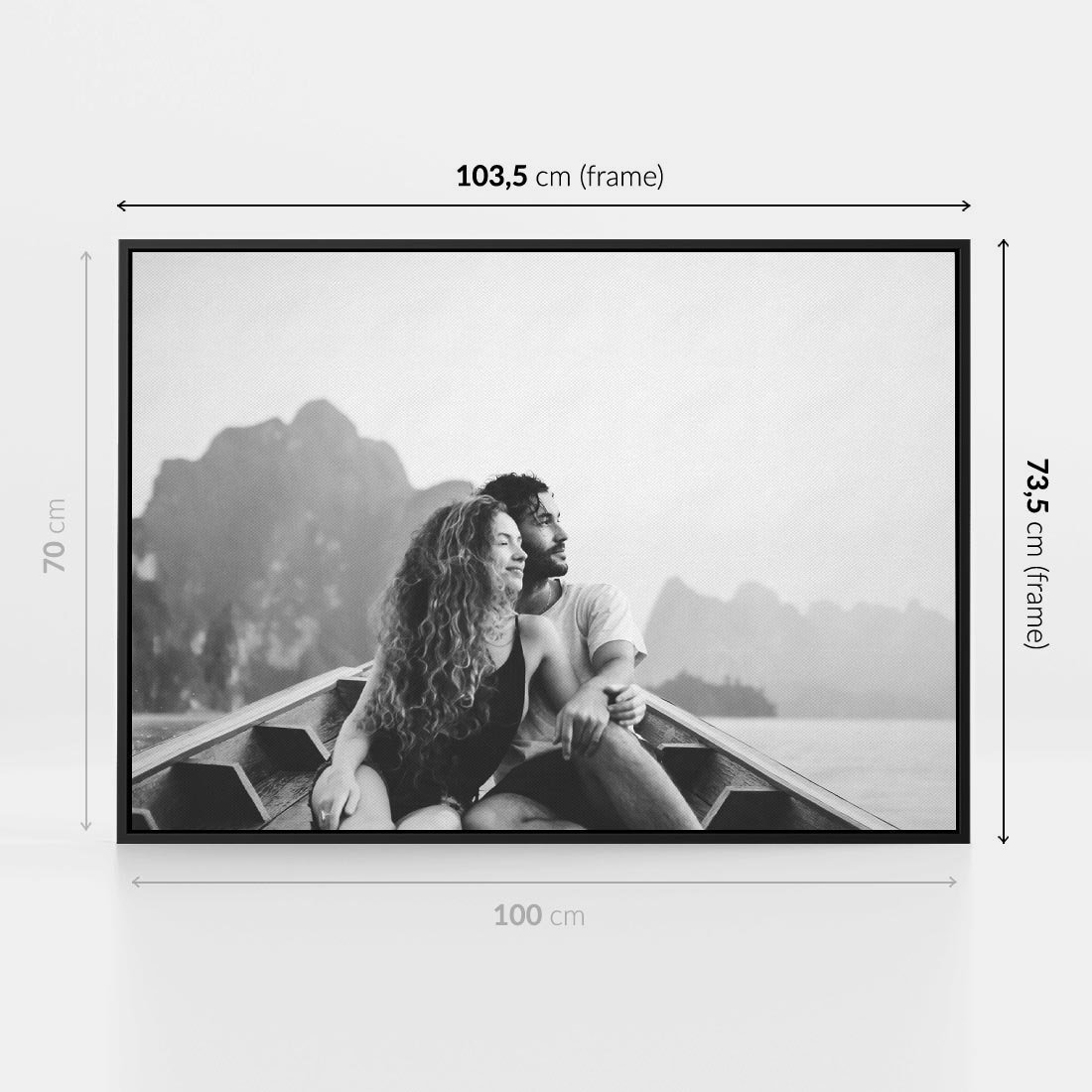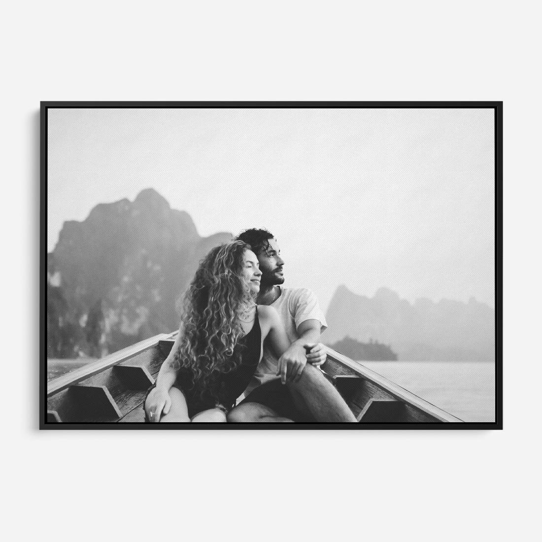 Obraz w ramie 100x70 - Księga mglistych marzeń - czarno biała fotografia, para zakochanych w łodzi - rama czarna