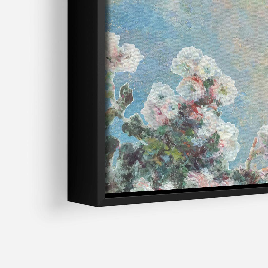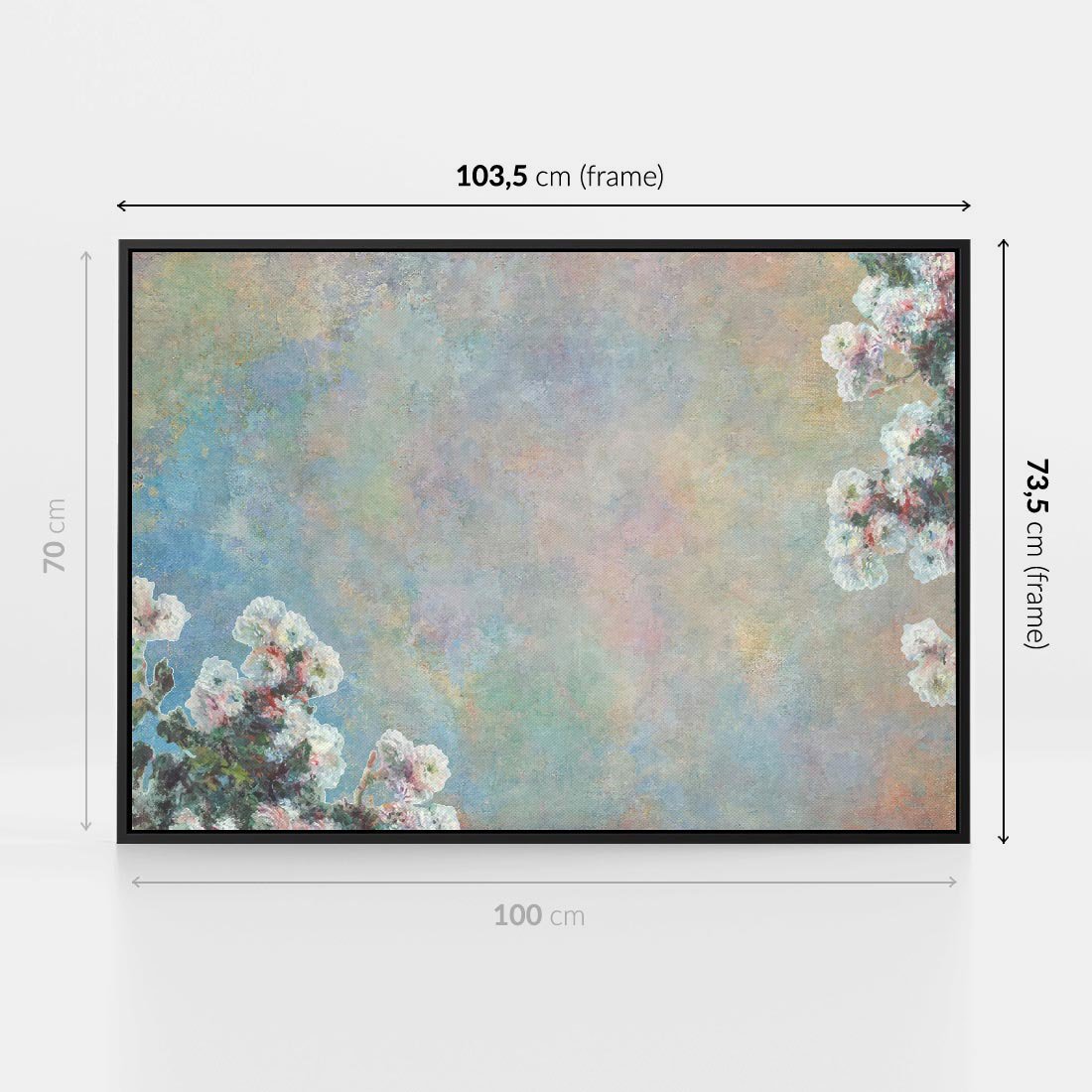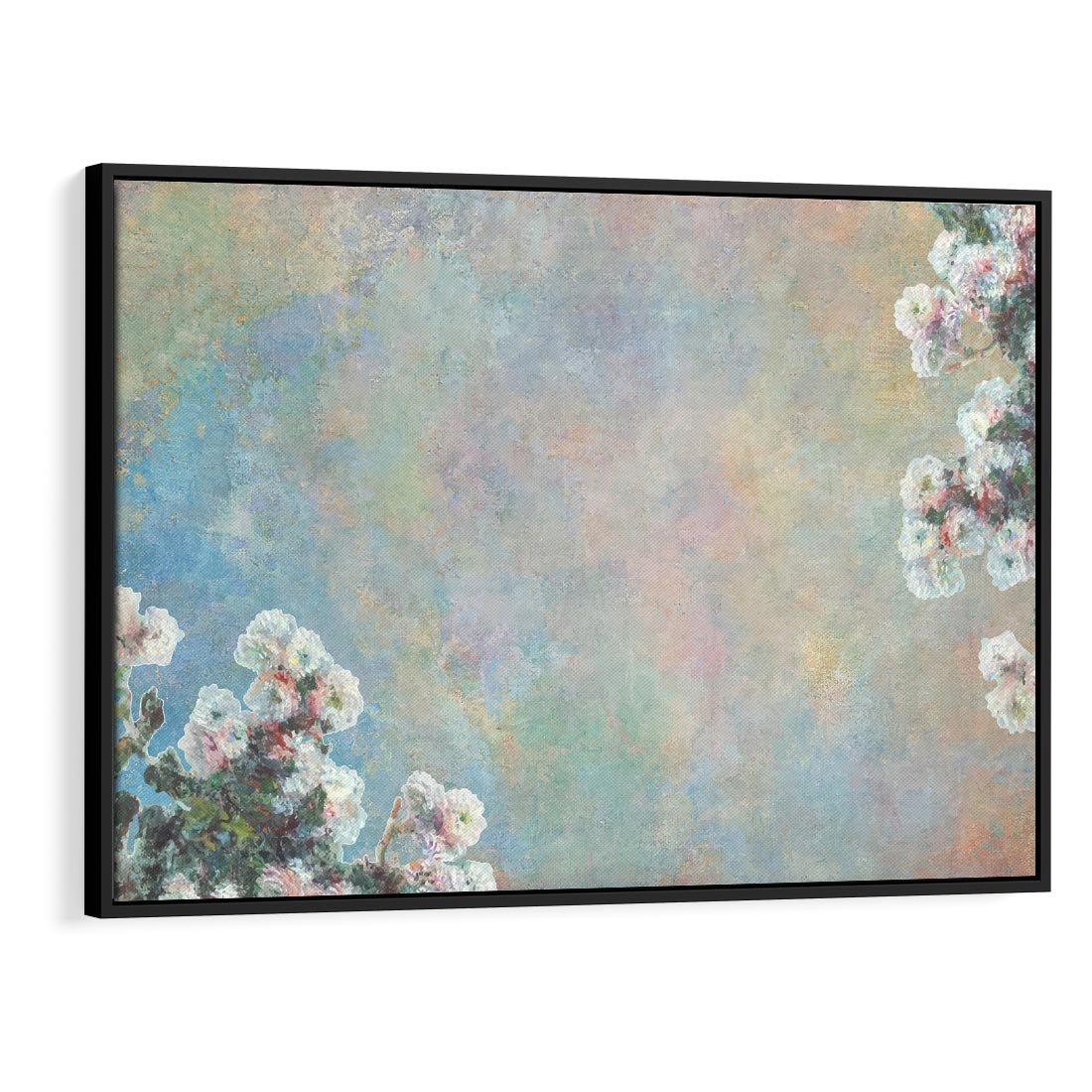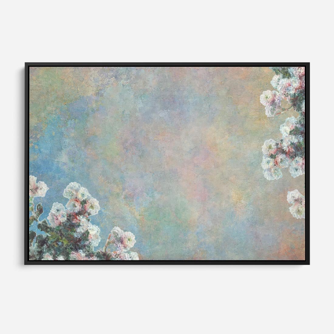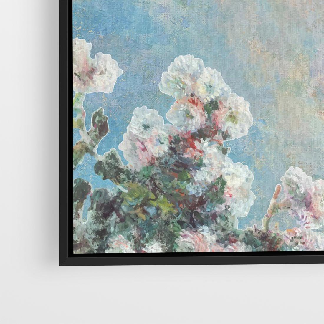 Ten subtelny obraz olejny przedstawia minimalistyczny układ, gdzie kwiaty delikatnie ukazują się w rogach pastelowego tła. To wyraz subtelności i spokoju, gdzie rośliny wiodą nas przez sielski krajobraz natury, pozostawiając główną rolę ich pięknu.