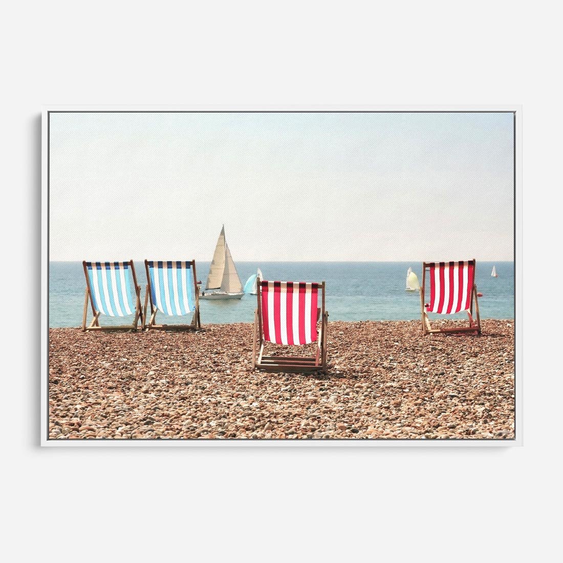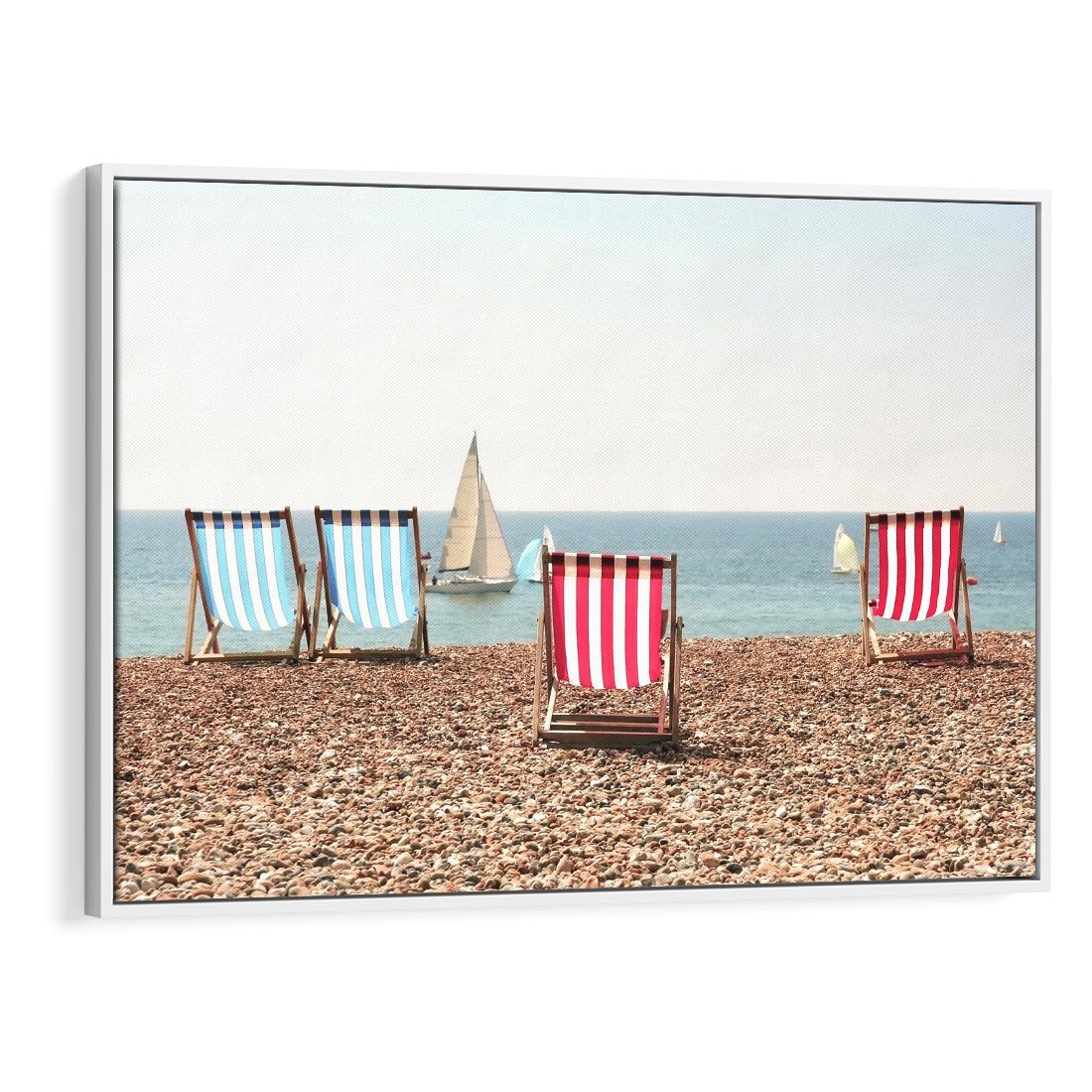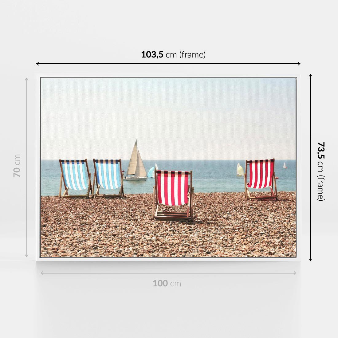Obraz w ramie 100x70 - Letnia retro bajka - fotografia, pasiaste leżaki - rama biała