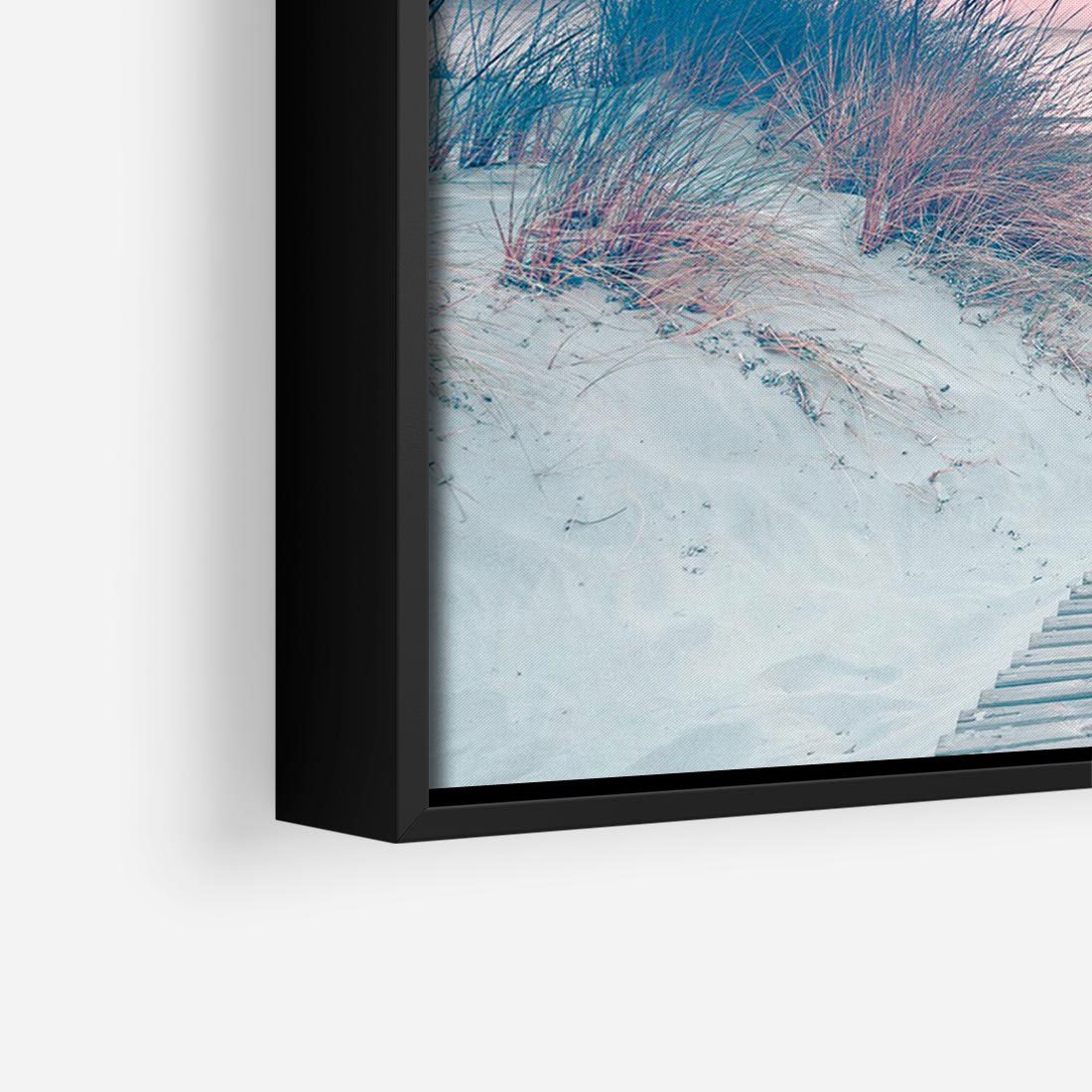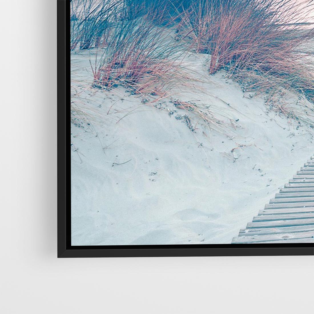 Podziwiaj piękno natury dzięki tej urokliwej fotografii. Na obrazie widzimy zachód słońca nad morzem, a stonowane kolory dodają magii chwili. Ścieżka wśród wydm prowadzi do spokojnego miejsca na plaży. To fotograficzne dzieło sztuki stworzone dla miłośników natury, romantycznych widoków i relaksu. Doskonały akcent dla tych, którzy pragną wprowadzić harmonię i spokój do swoich wnętrz.
