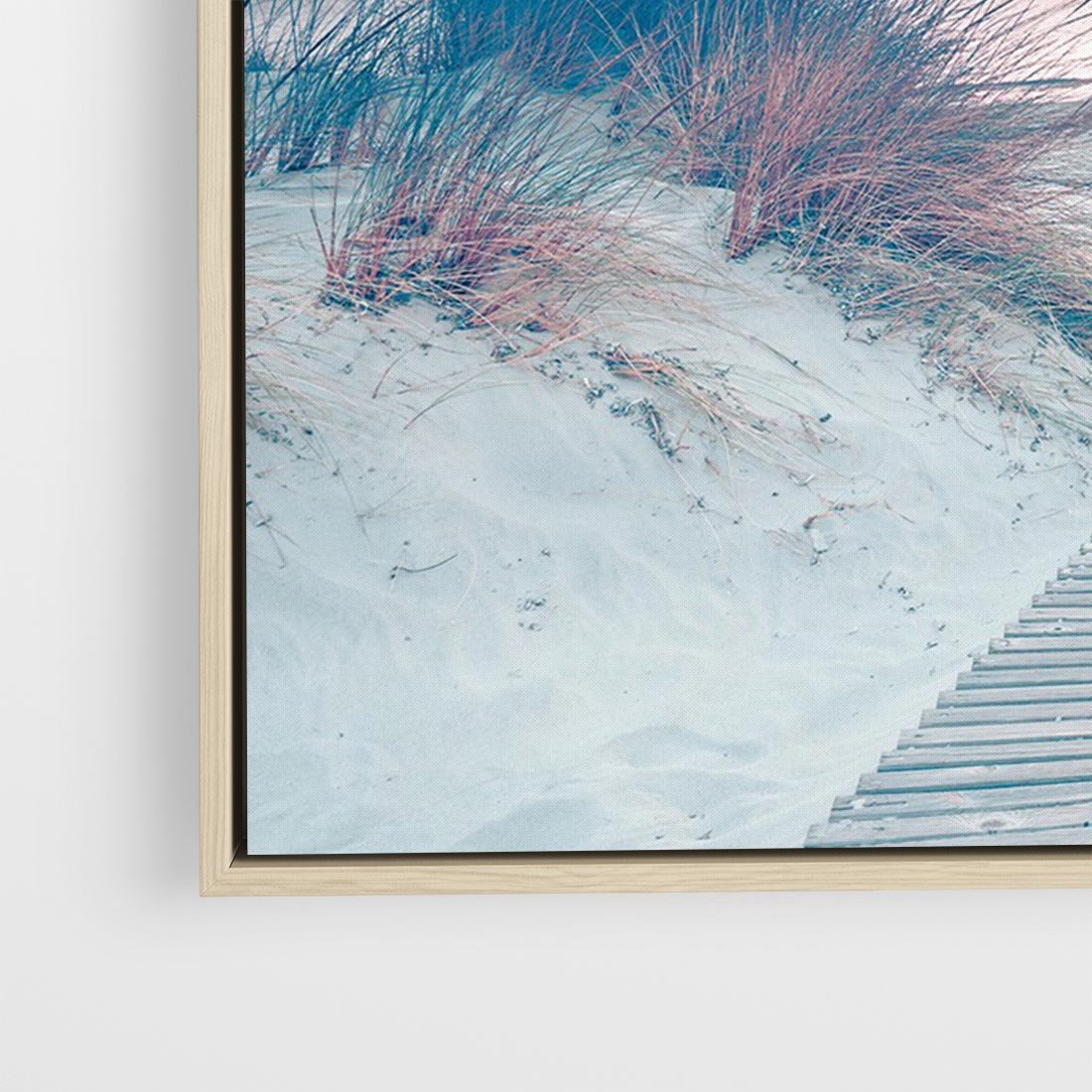 Podziwiaj piękno natury dzięki tej urokliwej fotografii. Na obrazie widzimy zachód słońca nad morzem, a stonowane kolory dodają magii chwili. Ścieżka wśród wydm prowadzi do spokojnego miejsca na plaży. To fotograficzne dzieło sztuki stworzone dla miłośników natury, romantycznych widoków i relaksu. Doskonały akcent dla tych, którzy pragną wprowadzić harmonię i spokój do swoich wnętrz.