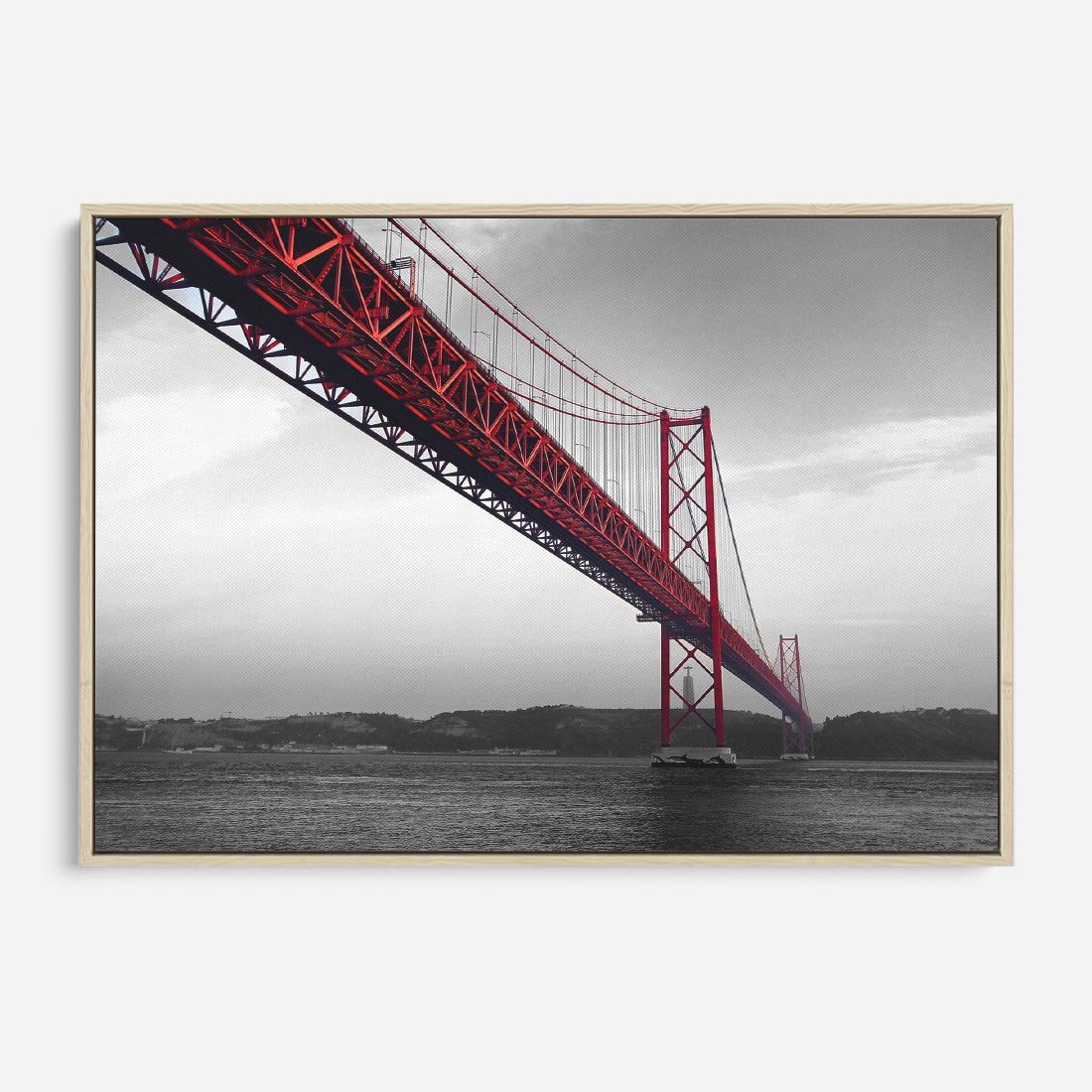 Obraz w ramie 100x70 - Majestatyczny Most - czarno biała fotografia, czerwony stalowy most nad rzeką - rama drewno