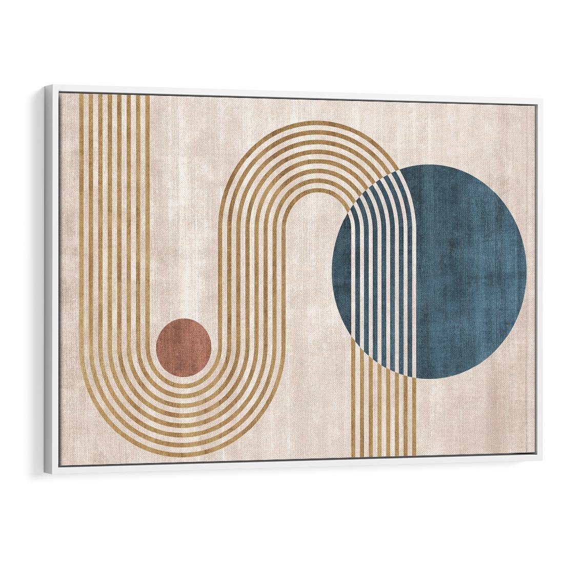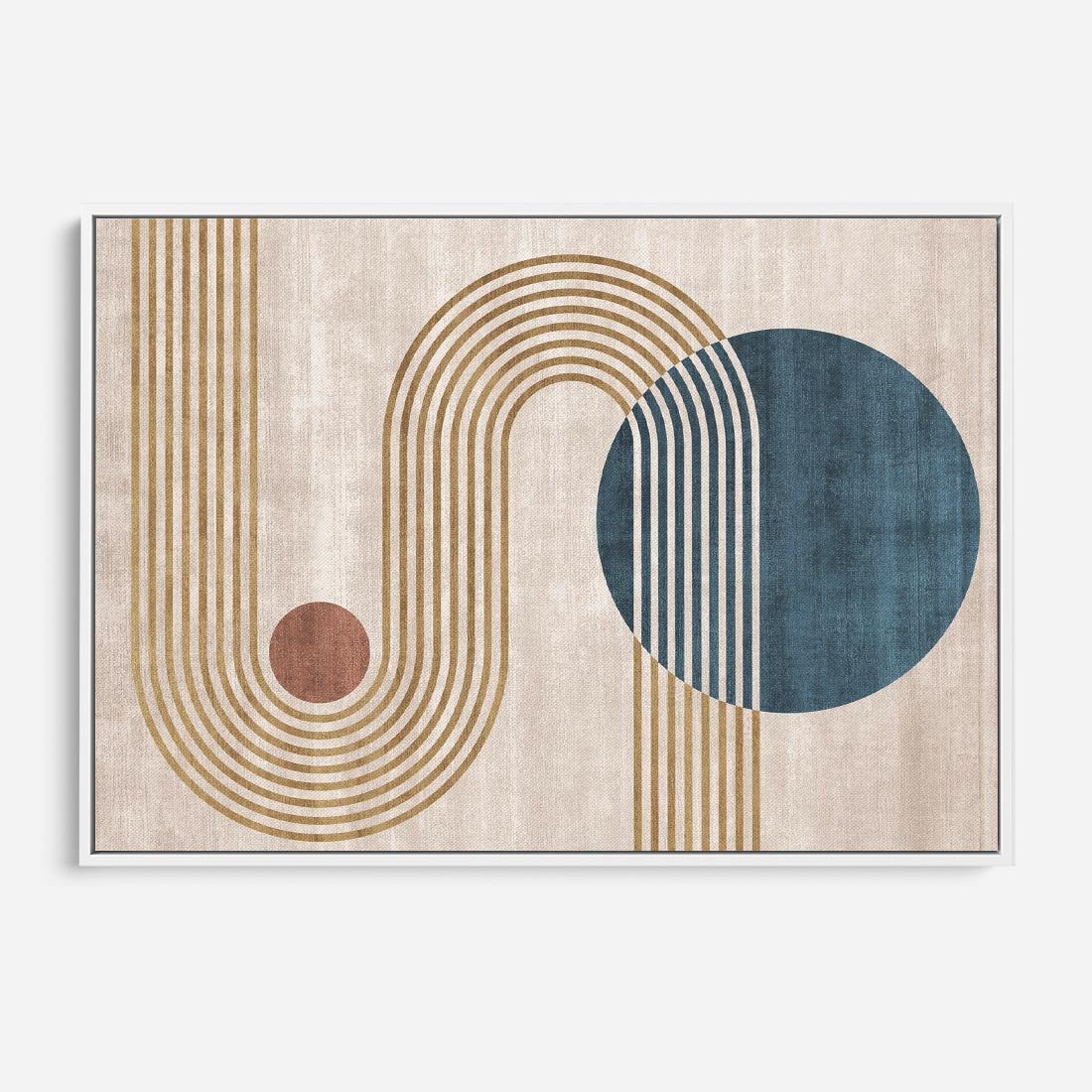 Ta retro grafika w stylu mid-century przenosi nas w świat eleganckich linii i harmonijnych kształtów. Odcienie beżu i złota tworzą ciepłą i luksusową aurę. Rozświetl swoje wnętrze złotymi wizjami z minionej epoki, gdzie formy i kolory harmonizują w hołdzie dla sztuki.