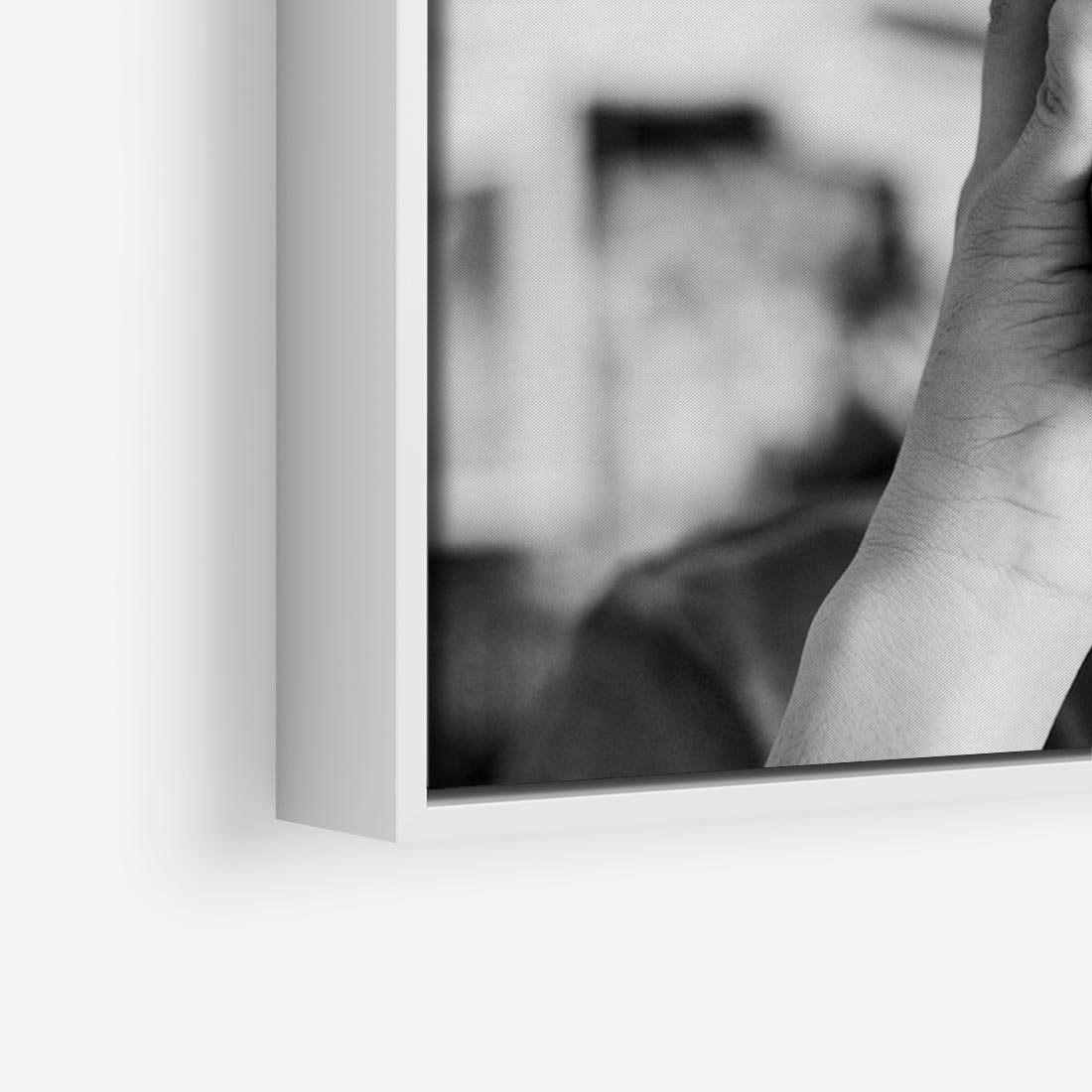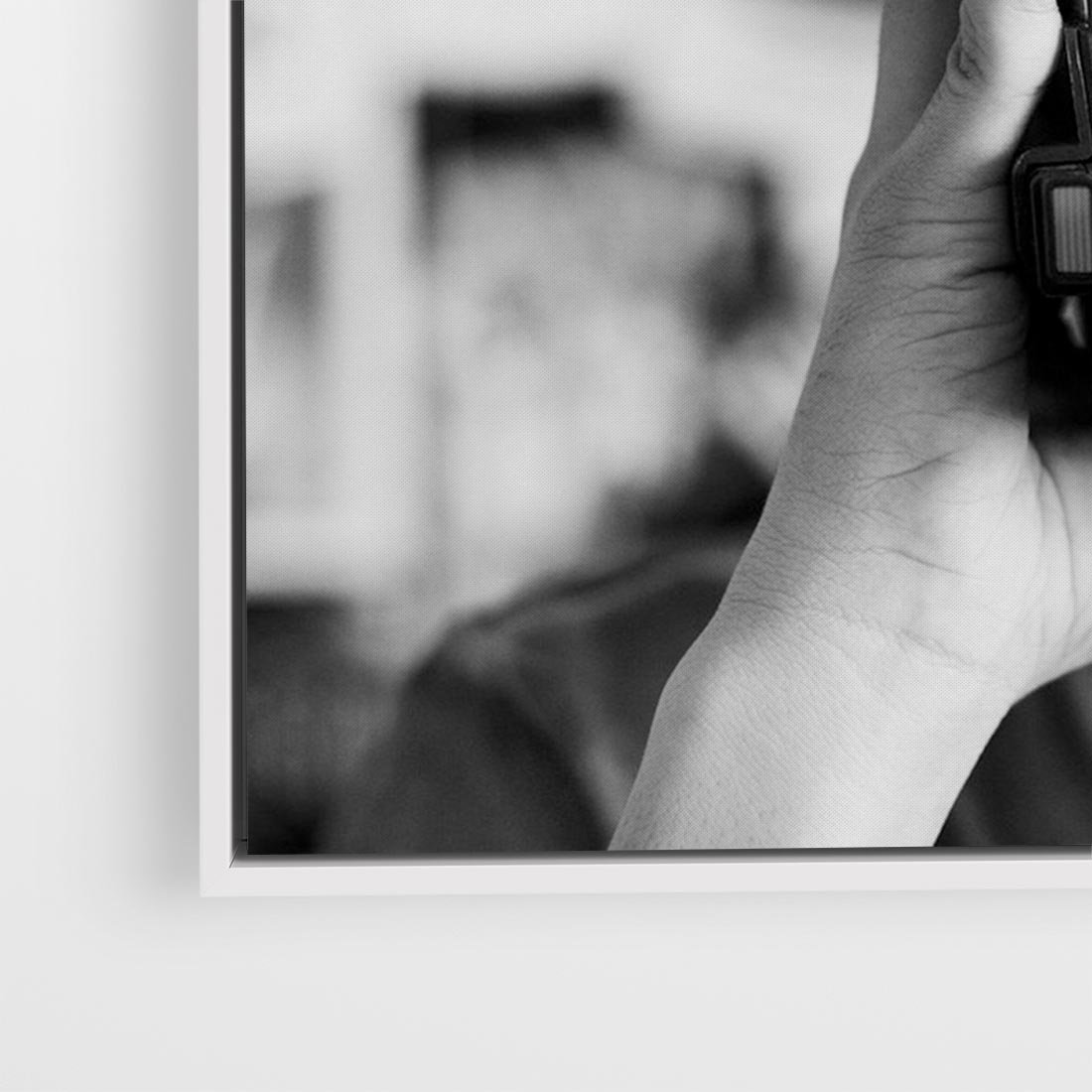 Obraz w ramie 100x70 - Mężczyzna za Aparatem - czarno białe zdjęcie, portret - rama biała