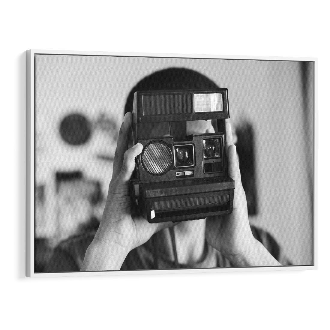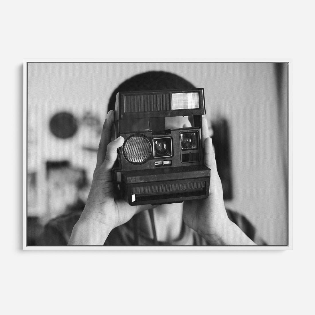 Czarno-biały portret przedstawia mężczyznę, który robi zdjęcie, używając polaroidu. Fotografia emanuje artystycznym wdziękiem, a klimat retro dodaje jej wyjątkowego charakteru. Ten obraz przenosi nas w świat sztuki i fotografii, wzbudzając zainteresowanie i ciekawość. Idealny dodatek do wnętrz, które pragną zachować artystyczną duszę.