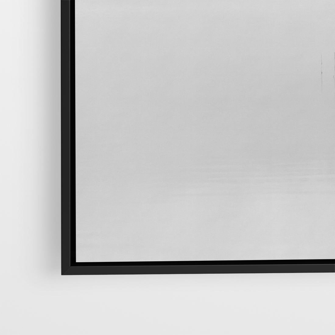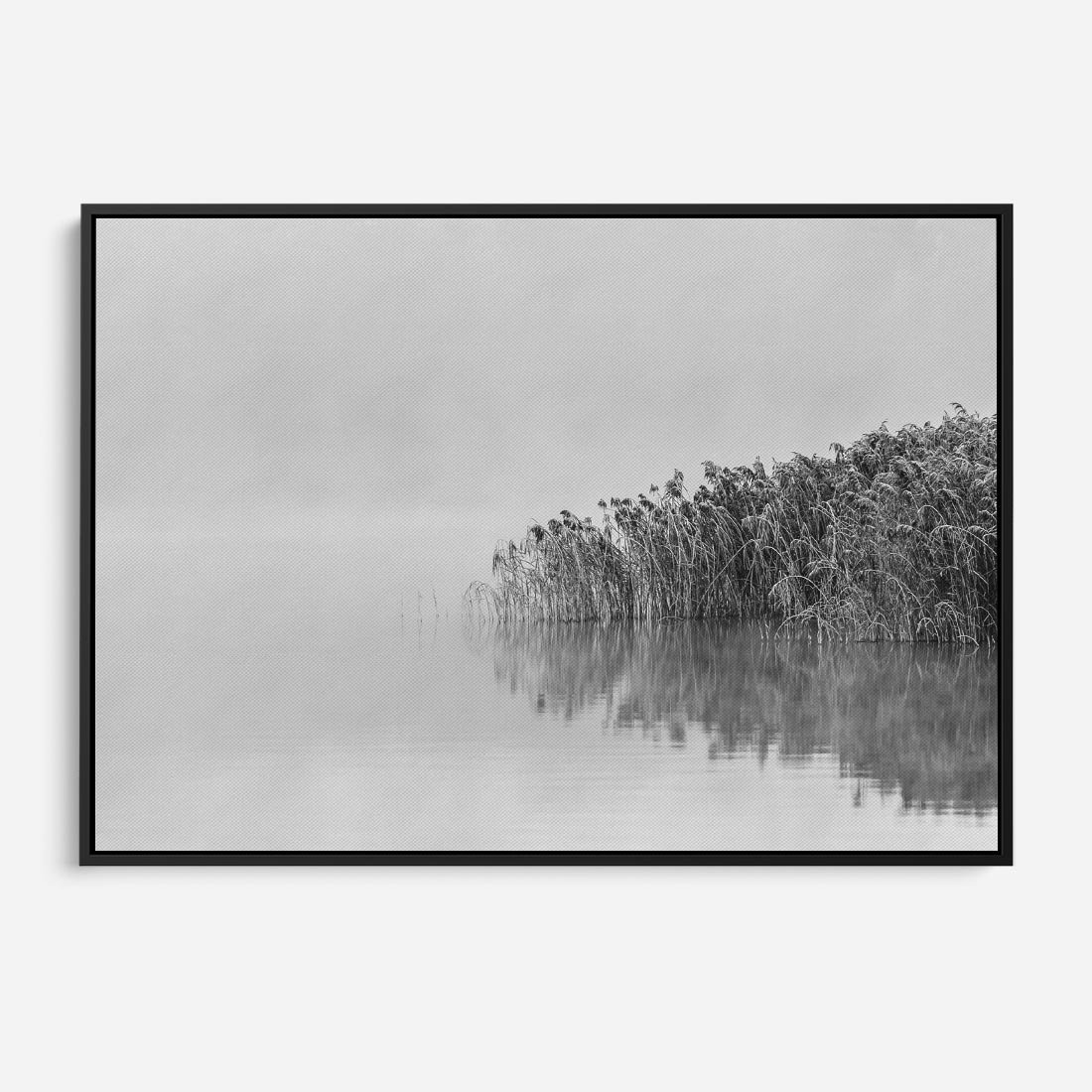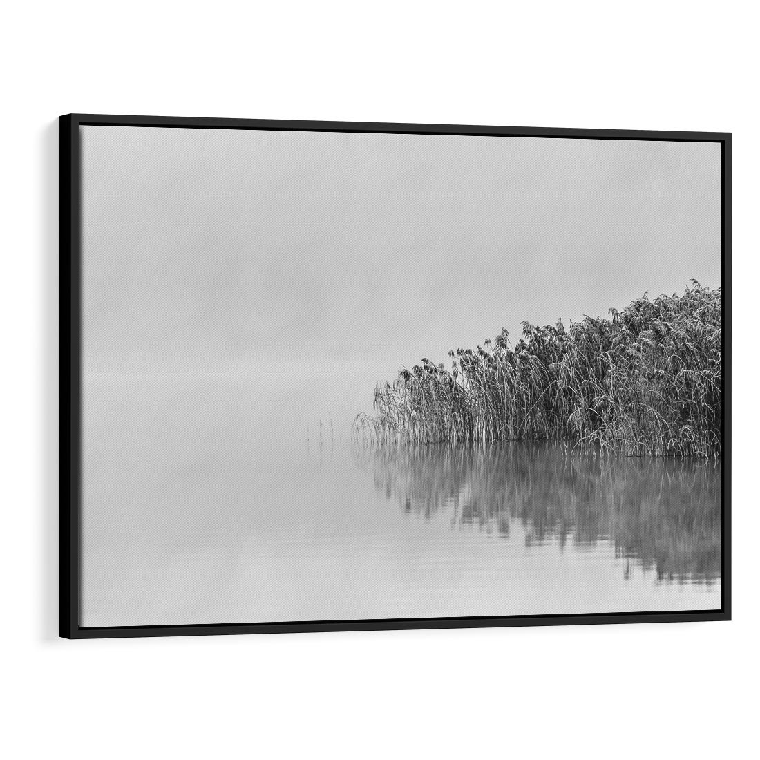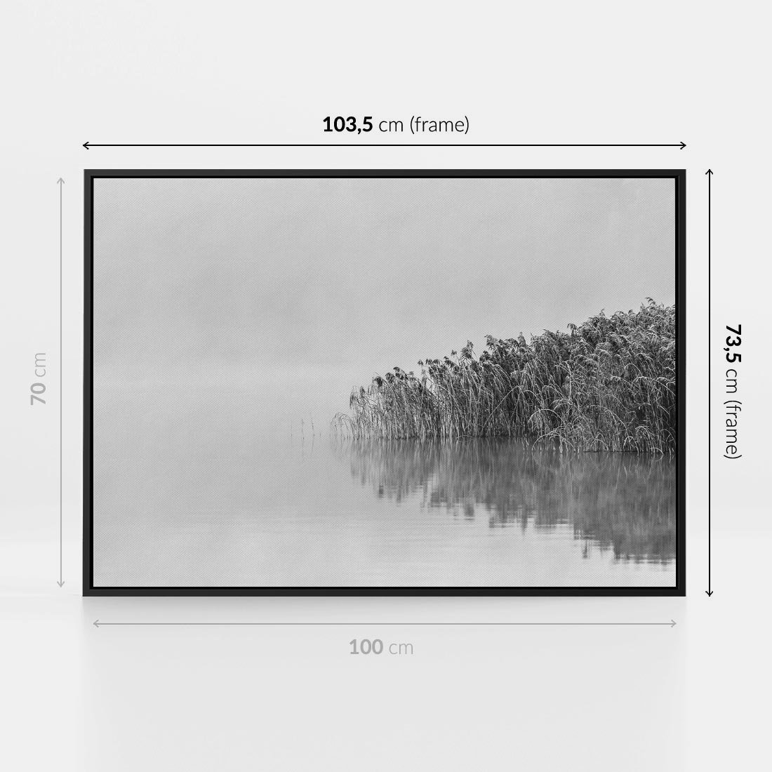 Obraz w ramie 100x70 - Mglisty Brzeg Jeziora - czarno białe zdjęcie, zamglone jezioro - rama czarna