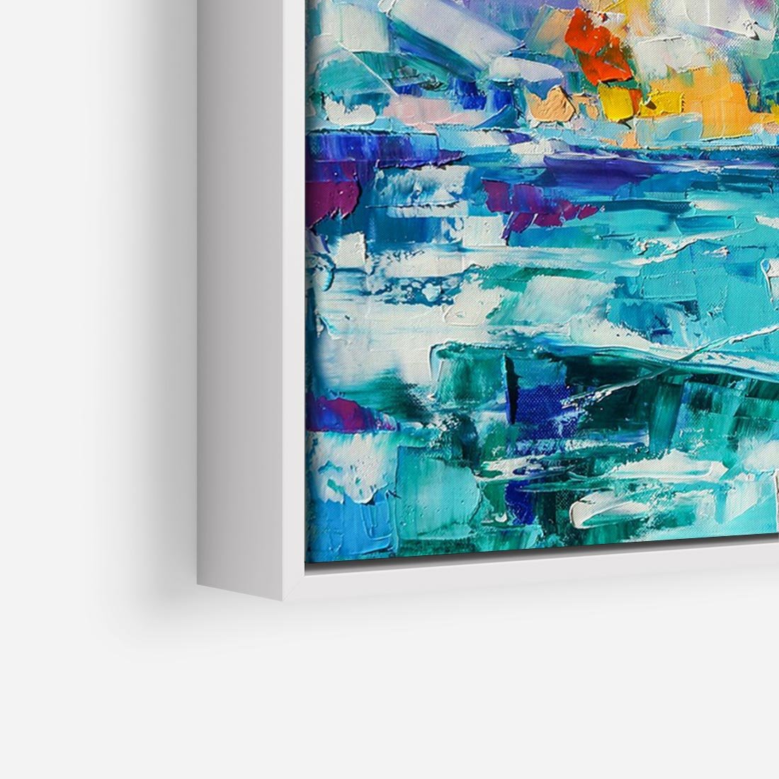 Abstrakcyjny pejzaż górskich szczytów w doskonałym harmonijnym tańcu. Odważne połączenia kolorów – głęboki błękit, ciepła żółć i tajemniczy fiolet – malowane techniką olejną. Ten niezwykły obraz wprowadzi magiczny nastrój do Twojego wnętrza, tworząc most pomiędzy rzeczywistością a abstrakcją.